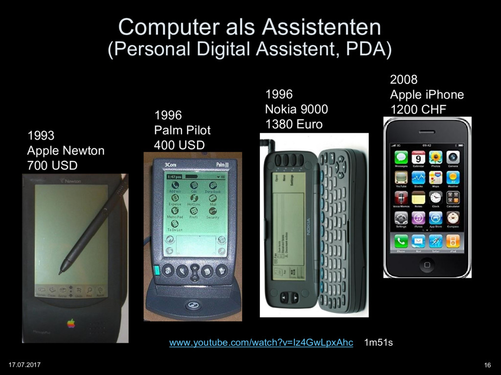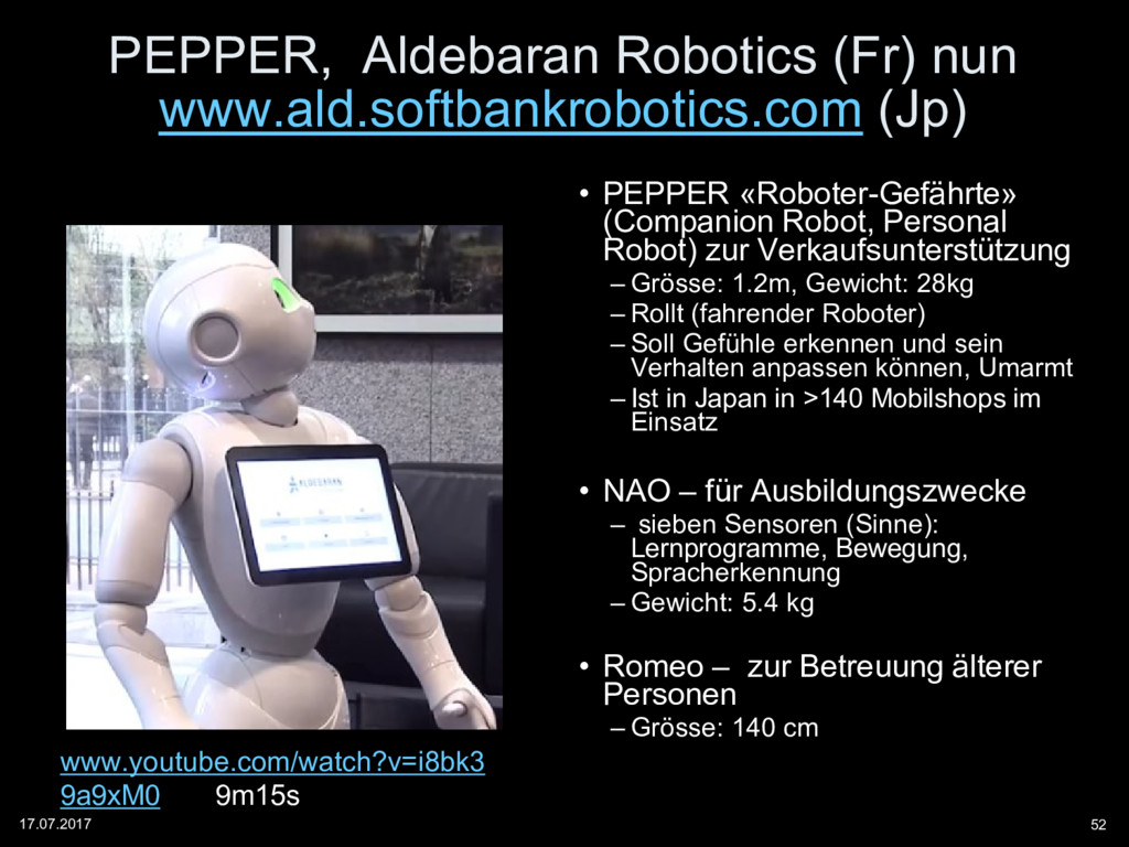 m – Gewicht: 72 kg – Boston Dynamics (Google) • SPOTmini – Grösse: 0.6 m – Gewicht: 24 kg – 90 min Betriebsdauer mit einer Batterieladung – Sensoren: Kamera, Gyroscope, Nähigkeitssensor – Boston Dynamics (Google) www.youtube.com/watch?v= tf7IEVTDjng&t=70s 2m27s www.youtube.com/watch?v =M8YjvHYbZ9w 2m15s 17.07.2017 51
