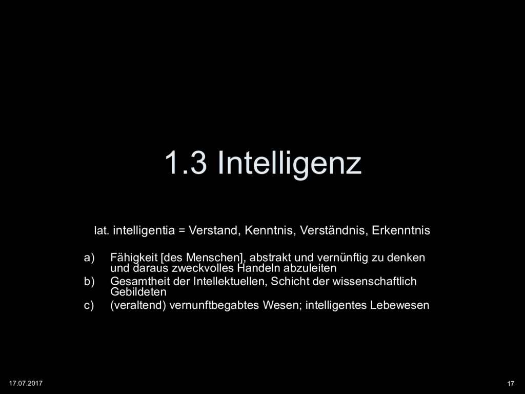 Fähigkeit [des Menschen], abstrakt und vernünftig zu denken und daraus zweckvolles Handeln abzuleiten b) Gesamtheit der Intellektuellen, Schicht der wissenschaftlich Gebildeten c) (veraltend) vernunftbegabtes Wesen; intelligentes Lebewesen 17.07.2017 17