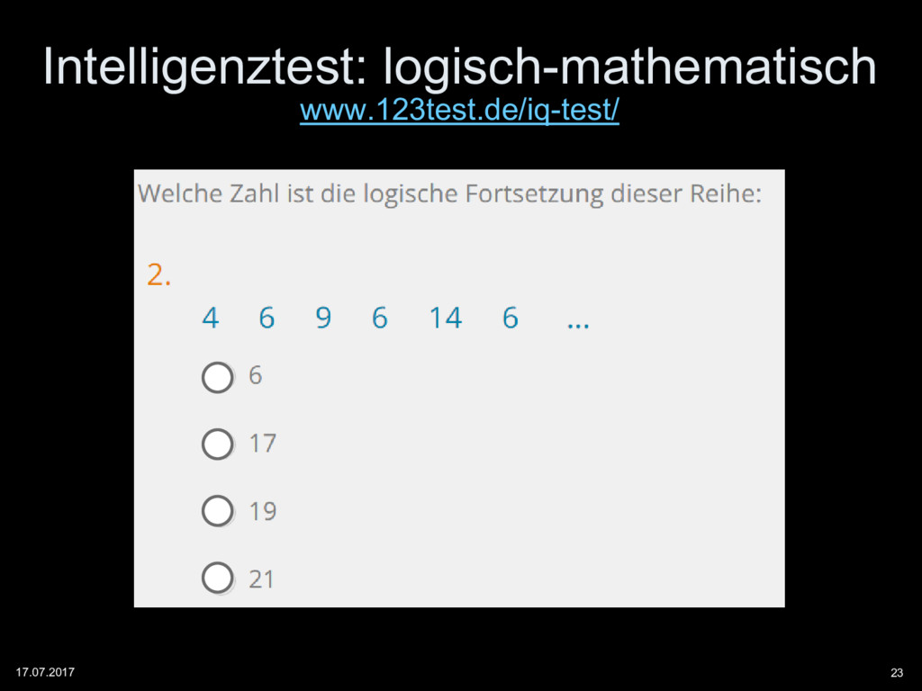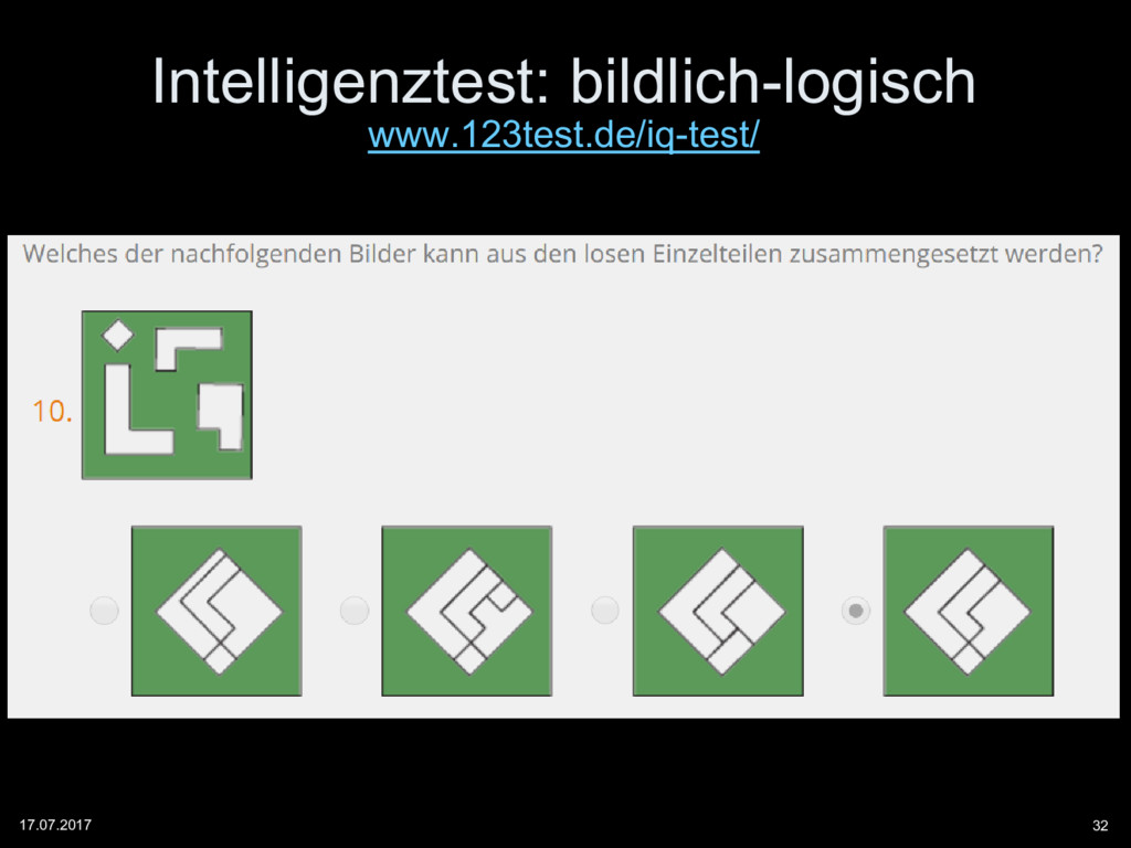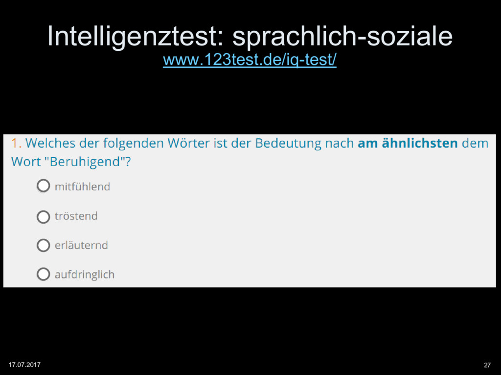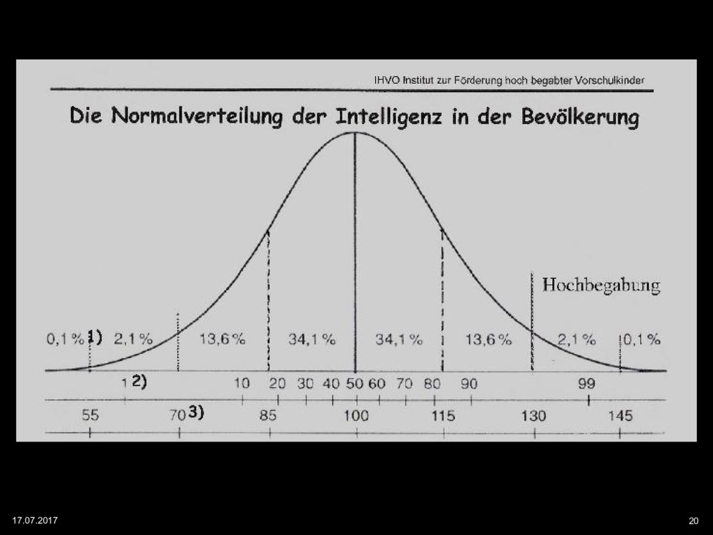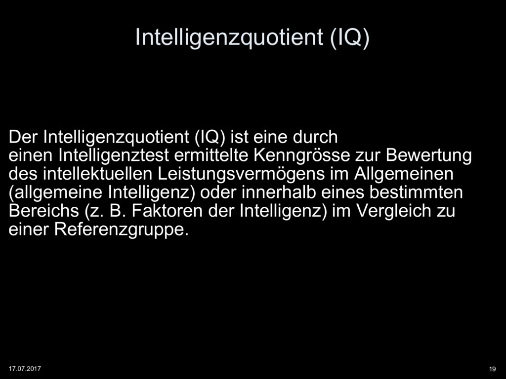 ermittelte Kenngrösse zur Bewertung des intellektuellen Leistungsvermögens im Allgemeinen (allgemeine Intelligenz) oder innerhalb eines bestimmten Bereichs (z. B. Faktoren der Intelligenz) im Vergleich zu einer Referenzgruppe. 17.07.2017 19