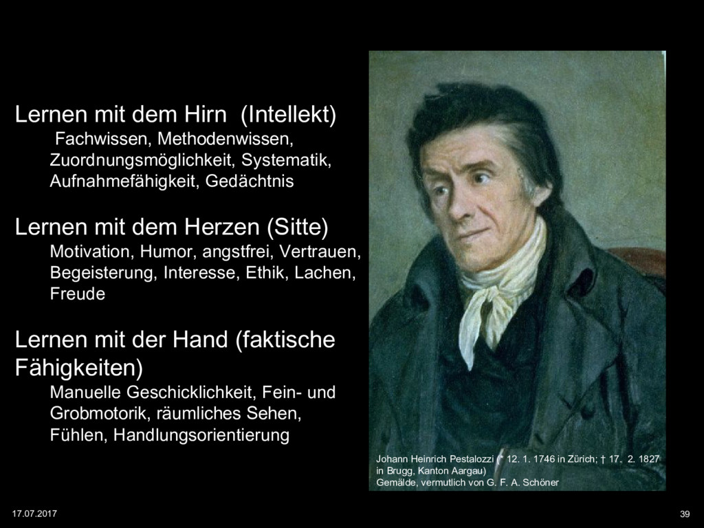 Gedächtnis Lernen mit dem Herzen (Sitte) Motivation, Humor, angstfrei, Vertrauen, Begeisterung, Interesse, Ethik, Lachen, Freude Lernen mit der Hand (faktische Fähigkeiten) Manuelle Geschicklichkeit, Fein- und Grobmotorik, räumliches Sehen, Fühlen, Handlungsorientierung 17.07.2017 39 Johann Heinrich Pestalozzi (* 12. 1. 1746 in Zürich; † 17. 2. 1827 in Brugg, Kanton Aargau) Gemälde, vermutlich von G. F. A. Schöner