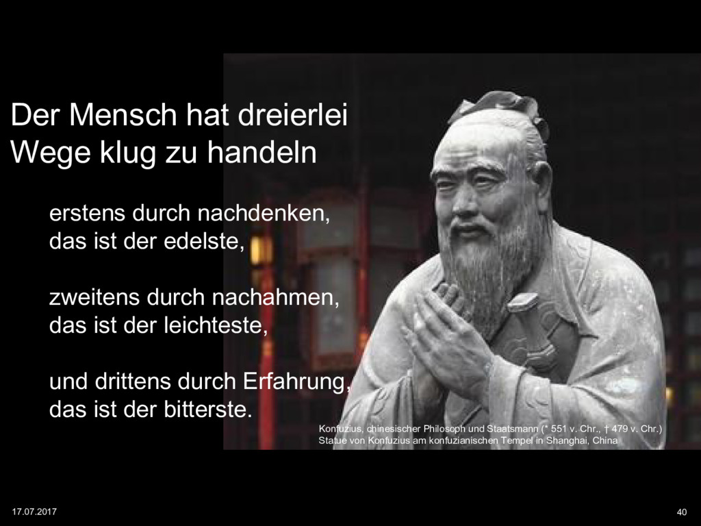 nachdenken, das ist der edelste, zweitens durch nachahmen, das ist der leichteste, und drittens durch Erfahrung, das ist der bitterste. 17.07.2017 40 Konfuzius, chinesischer Philosoph und Staatsmann (* 551 v. Chr., † 479 v. Chr.) Statue von Konfuzius am konfuzianischen Tempel in Shanghai, China