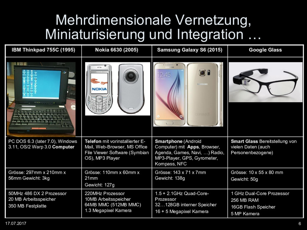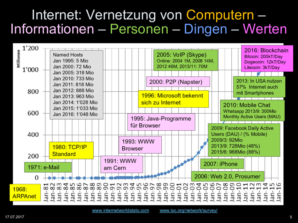 – Werten www.internetworldstats.com www.isc.org/network/survey/ Named Hosts Jan 1995: 5 Mio Jan 2000: 72 Mio Jan 2005: 318 Mio Jan 2010: 733 Mio Jan 2011: 818 Mio Jan 2012: 888 Mio Jan 2013: 963 Mio Jan 2014: 1‘028 Mio Jan 2015: 1‘033 Mio Jan 2016: 1‘048 Mio 1968: ARPAnet 1980: TCP/IP Standard 2000: P2P (Napster) 1995: Java-Programme für Browser 1996: Microsoft bekennt sich zu Internet 2006: Web 2.0, Prosumer 2009: Facebook Daily Active Users (DAU) / (% Mobile) 2009/3: 92Mio 2013/9: 728Mio (48%) 2015/6: 968Mio (88%) 2007: iPhone 2013: In USA nutzen 57% Internet auch mit Smartphones 2010: Mobile Chat Whatsapp 2013/9: 300Mio Monthly Active Users (MAU) 1991: WWW am Cern 1993: WWW Browser 2005: VoIP (Skype) Online: 2004 1M, 2008 14M, 2012 46M, 2013/11: 70M 1971: e-Mail 2016: Blockchain Bitcoin: 200kT/Day Dogecoin: 12kT/Day Litecoin: 3kT/Day 17.07.2017 5