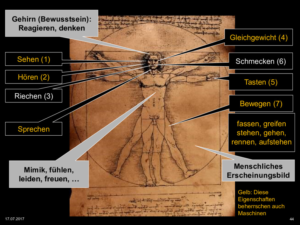 Funktionen eines Menschen ausführen kann; Maschinenmensch b) (Technik) (mit Greifarmen ausgerüsteter) Automat, der ferngesteuert oder nach Sensorsignalen bzw. einprogrammierten Befehlsfolgen anstelle eines Menschen bestimmte mechanische Tätigkeiten verrichtet c) (früher) Arbeiter im Frondienst 17.07.2017 45