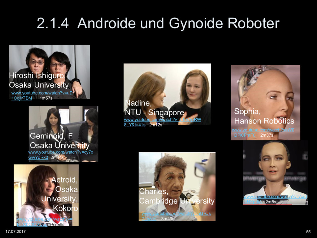 (Companion Robot, Personal Robot) zur Verkaufsunterstützung – Grösse: 1.2m, Gewicht: 28kg – Rollt (fahrender Roboter) – Soll Gefühle erkennen und sein Verhalten anpassen können, Umarmt – Ist in Japan in >140 Mobilshops im Einsatz • NAO – für Ausbildungszwecke – sieben Sensoren (Sinne): Lernprogramme, Bewegung, Spracherkennung – Gewicht: 5.4 kg • Romeo – zur Betreuung älterer Personen – Grösse: 140 cm www.youtube.com/watch?v=i8bk3 9a9xM0 9m15s 17.07.2017 52