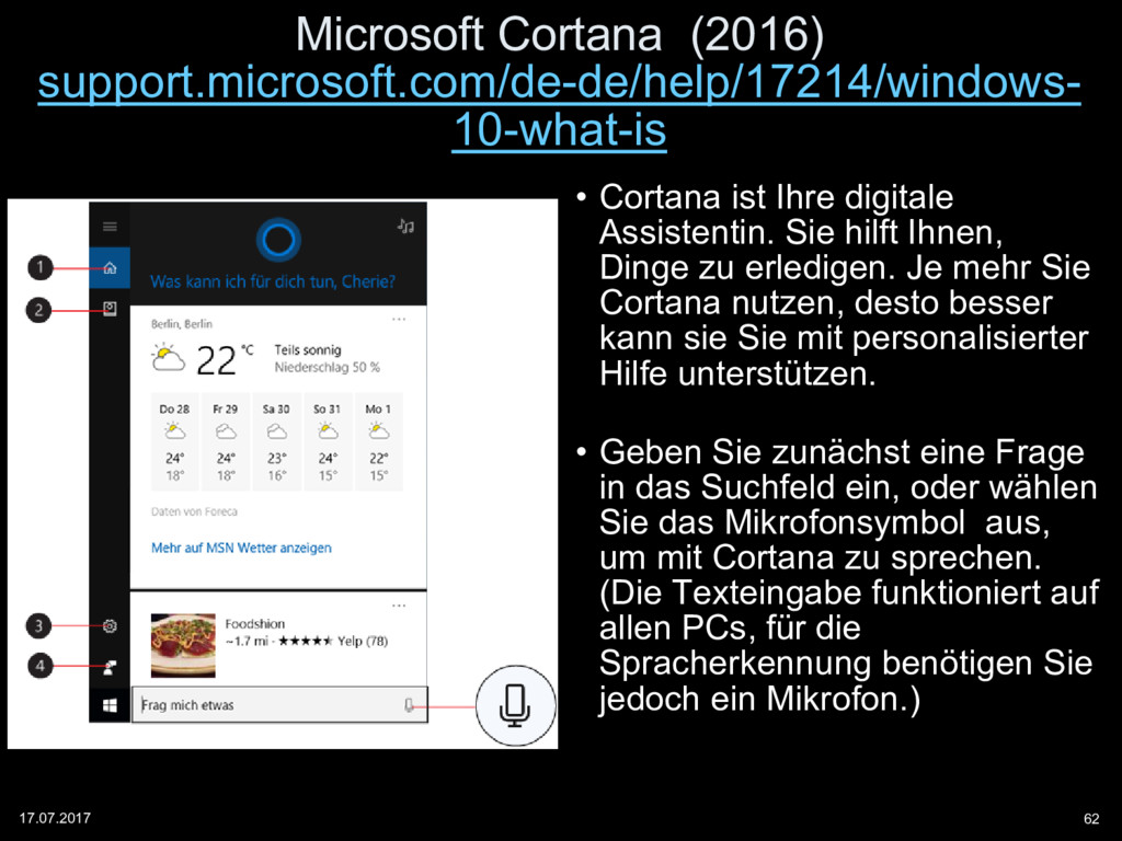 Assistentin. Sie hilft Ihnen, Dinge zu erledigen. Je mehr Sie Cortana nutzen, desto besser kann sie Sie mit personalisierter Hilfe unterstützen. • Geben Sie zunächst eine Frage in das Suchfeld ein, oder wählen Sie das Mikrofonsymbol aus, um mit Cortana zu sprechen. (Die Texteingabe funktioniert auf allen PCs, für die Spracherkennung benötigen Sie jedoch ein Mikrofon.) 17.07.2017 62