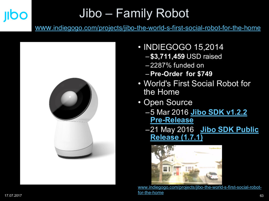 raised –2287% funded on –Pre-Order for $749 • World's First Social Robot for the Home • Open Source –5 Mar 2016 Jibo SDK v1.2.2 Pre-Release –21 May 2016 Jibo SDK Public Release (1.7.1) www.indiegogo.com/projects/jibo-the-world-s-first-social-robot- for-the-home 17.07.2017 63