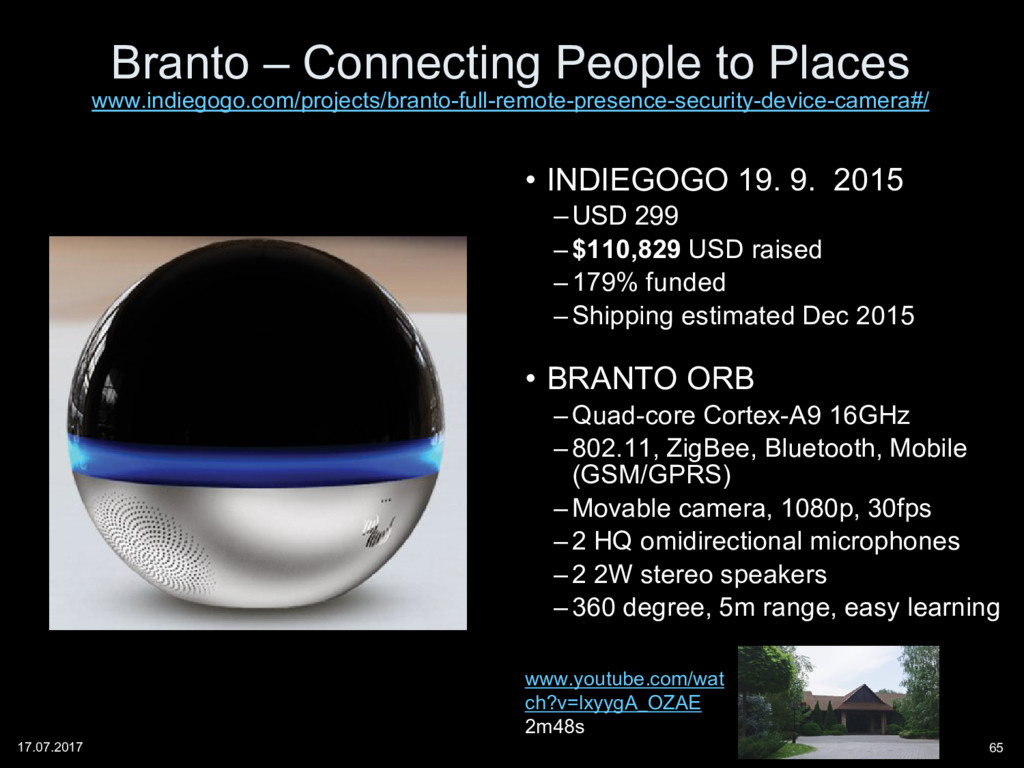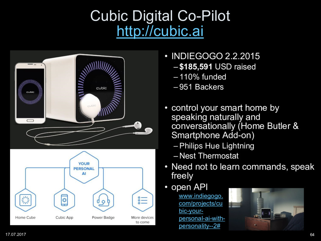 – 110% funded – 951 Backers • control your smart home by speaking naturally and conversationally (Home Butler & Smartphone Add-on) – Philips Hue Lightning –Nest Thermostat • Need not to learn commands, speak freely • open API www.indiegogo. com/projects/cu bic-your- personal-ai-with- personality--2# 17.07.2017 64