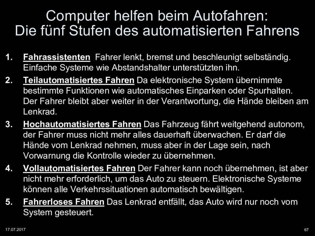 1. Fahrassistenten Fahrer lenkt, bremst und beschleunigt selbständig. Einfache Systeme wie Abstandshalter unterstützten ihn. 2. Teilautomatisiertes Fahren Da elektronische System übernimmte bestimmte Funktionen wie automatisches Einparken oder Spurhalten. Der Fahrer bleibt aber weiter in der Verantwortung, die Hände bleiben am Lenkrad. 3. Hochautomatisiertes Fahren Das Fahrzeug fährt weitgehend autonom, der Fahrer muss nicht mehr alles dauerhaft überwachen. Er darf die Hände vom Lenkrad nehmen, muss aber in der Lage sein, nach Vorwarnung die Kontrolle wieder zu übernehmen. 4. Vollautomatisiertes Fahren Der Fahrer kann noch übernehmen, ist aber nicht mehr erforderlich, um das Auto zu steuern. Elektronische Systeme können alle Verkehrssituationen automatisch bewältigen. 5. Fahrerloses Fahren Das Lenkrad entfällt, das Auto wird nur noch vom System gesteuert. 17.07.2017 67