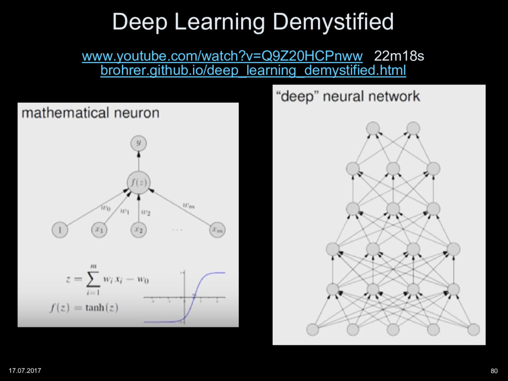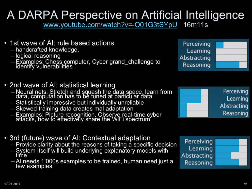 wave of AI: rule based actions – handcrafted knowledge, – logical reasoning – Examples: Chess computer, Cyber grand_challenge to identify vulnerabilities • 2nd wave of AI: statistical learning – Neural nets: Stretch and squash the data space, learn from data, computation has to be tuned at particular data – Statistically impressive but individually unreliable – Skewed training data creates mal adaptation – Examples: Picture recognition, Observe real-time cyber attacks, how to effectively share the WiFi spectrum • 3rd (future) wave of AI: Contextual adaptation – Provide clarity about the reasons of taking a specific decision – System itself will build underlying explanatory models with time – AI needs 1’000s examples to be trained, human need just a few examples 17.07.2017 72