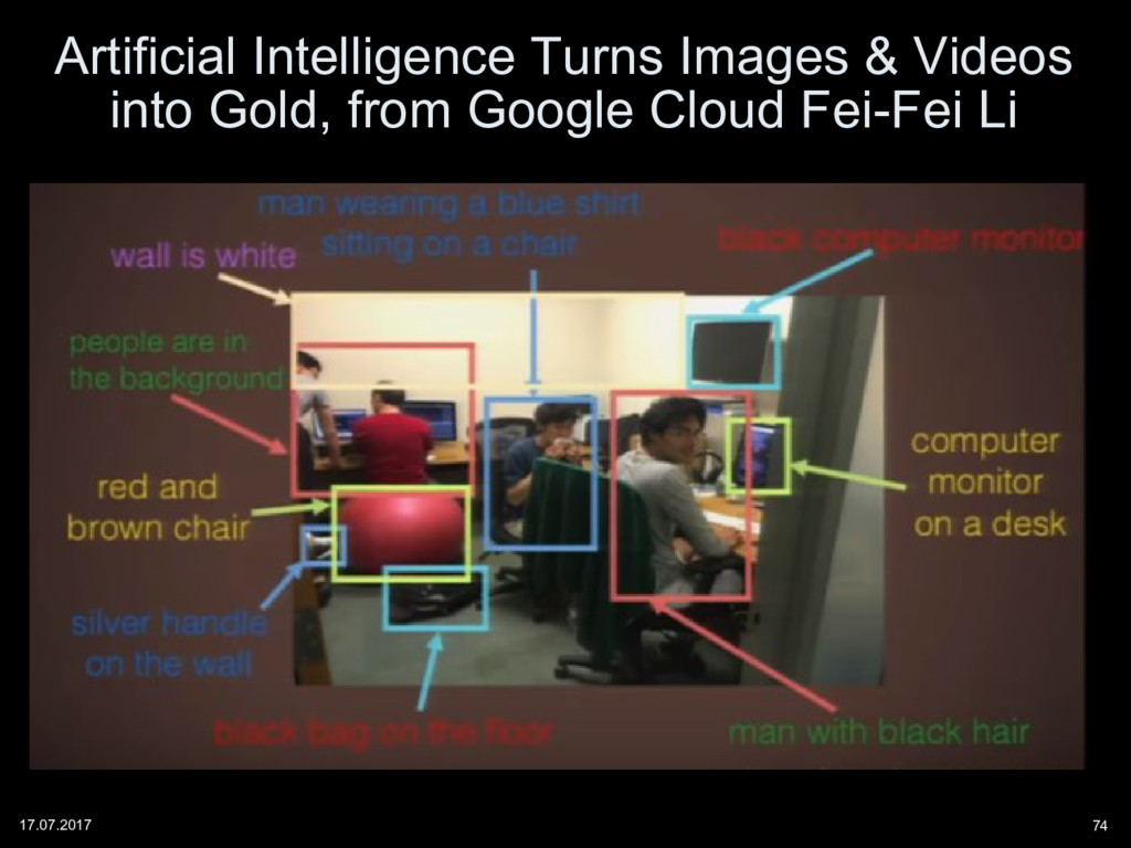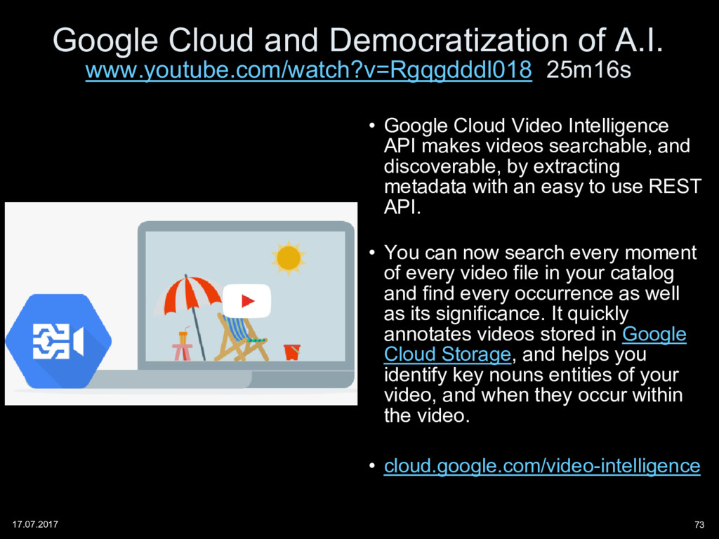 Cloud Video Intelligence API makes videos searchable, and discoverable, by extracting metadata with an easy to use REST API. • You can now search every moment of every video file in your catalog and find every occurrence as well as its significance. It quickly annotates videos stored in Google Cloud Storage, and helps you identify key nouns entities of your video, and when they occur within the video. • cloud.google.com/video-intelligence 17.07.2017 73