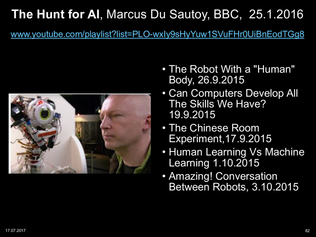 • The Robot With a "Human" Body, 26.9.2015 • Can Computers Develop All The Skills We Have? 19.9.2015 • The Chinese Room Experiment,17.9.2015 • Human Learning Vs Machine Learning 1.10.2015 • Amazing! Conversation Between Robots, 3.10.2015 17.07.2017 82