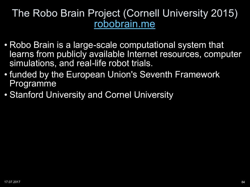 Brain is a large-scale computational system that learns from publicly available Internet resources, computer simulations, and real-life robot trials. • funded by the European Union's Seventh Framework Programme • Stanford University and Cornel University 17.07.2017 84