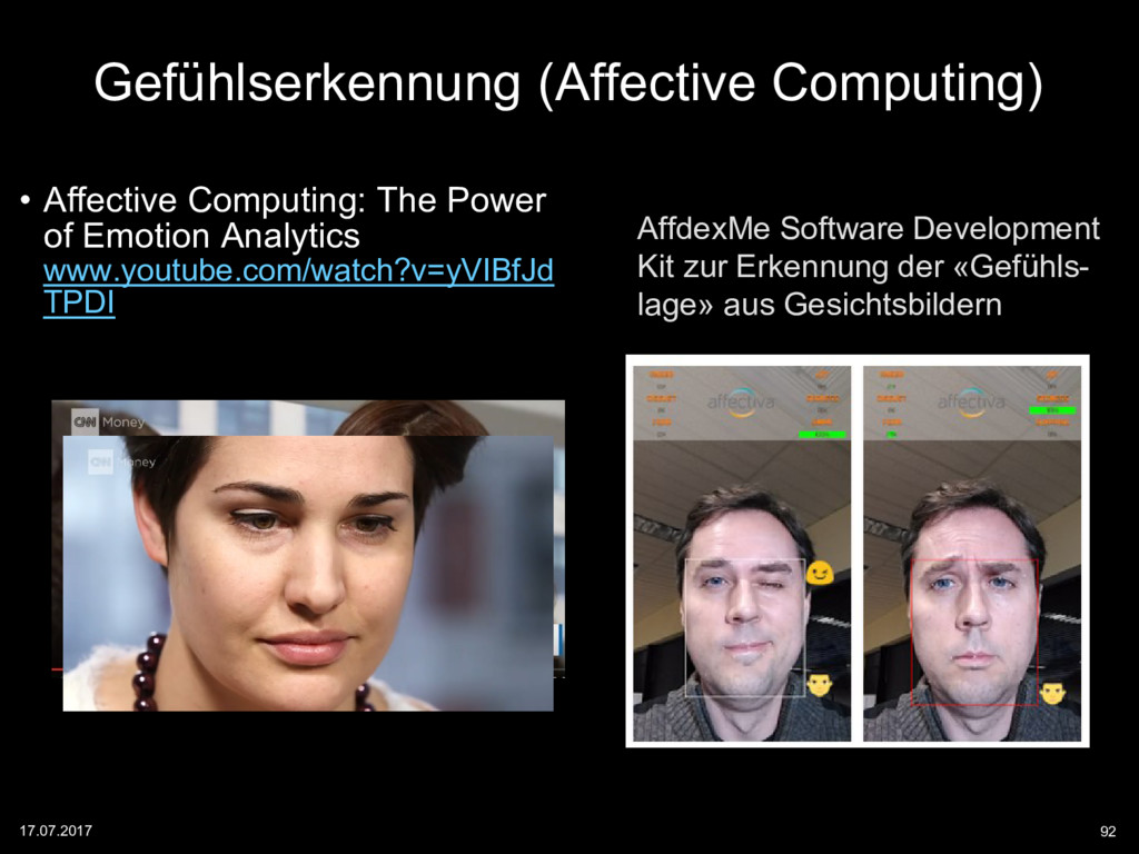 Analytics www.youtube.com/watch?v=yVIBfJd TPDI (2:29) AffdexMe Software Development Kit zur Erkennung der «Gefühls- lage» aus Gesichtsbildern 17.07.2017 92