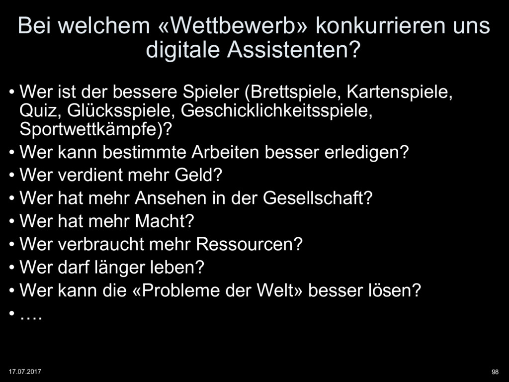 der bessere Spieler (Brettspiele, Kartenspiele, Quiz, Glücksspiele, Geschicklichkeitsspiele, Sportwettkämpfe)? • Wer kann bestimmte Arbeiten besser erledigen? • Wer verdient mehr Geld? • Wer hat mehr Ansehen in der Gesellschaft? • Wer hat mehr Macht? • Wer verbraucht mehr Ressourcen? • Wer darf länger leben? • Wer kann die «Probleme der Welt» besser lösen? • …. 17.07.2017 98