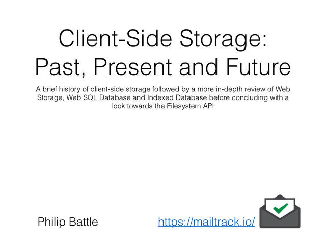 client-side storage followed by a more in-depth review of Web Storage, Web SQL Database and Indexed Database before concluding with a look towards the Filesystem API Philip Battle https://mailtrack.io/