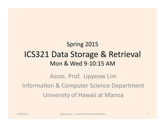The Complete Book (2nd Edi:on). – Hector Garcia-‐Molina, Jeff Ullman, and Jennifer Widom. – ISBN-‐13: 978-‐0-‐13-‐187325-‐4. • Alternate: – A First Course in Database Systems (3nd Edi:on). – Jeff Ullman, and Jennifer Widom • Previous: – Database Management Systems, Third Edi:on. – Raghu Ramakrishnan and Johannes Gehrke. 8/26/2014 Lipyeow Lim -‐-‐ University of Hawaii at Manoa 5
