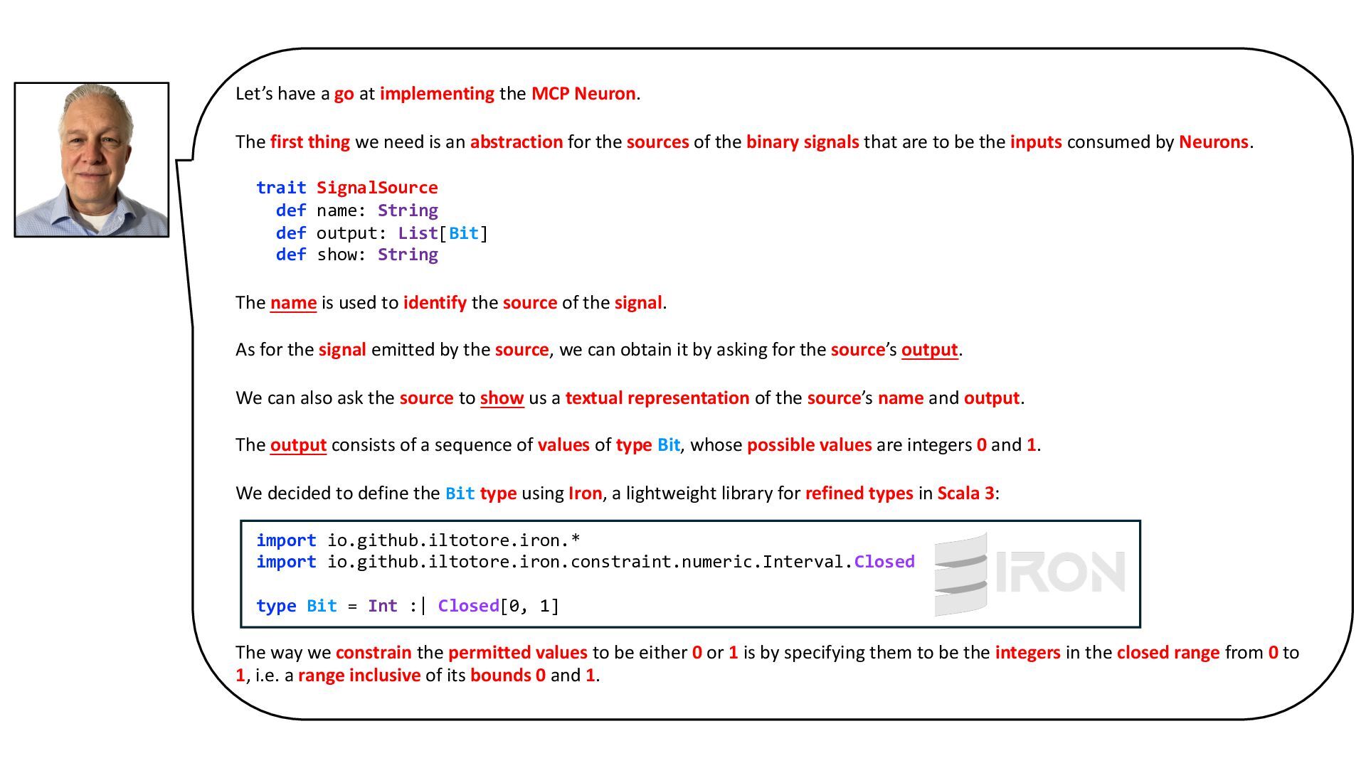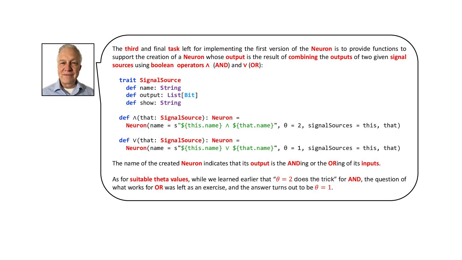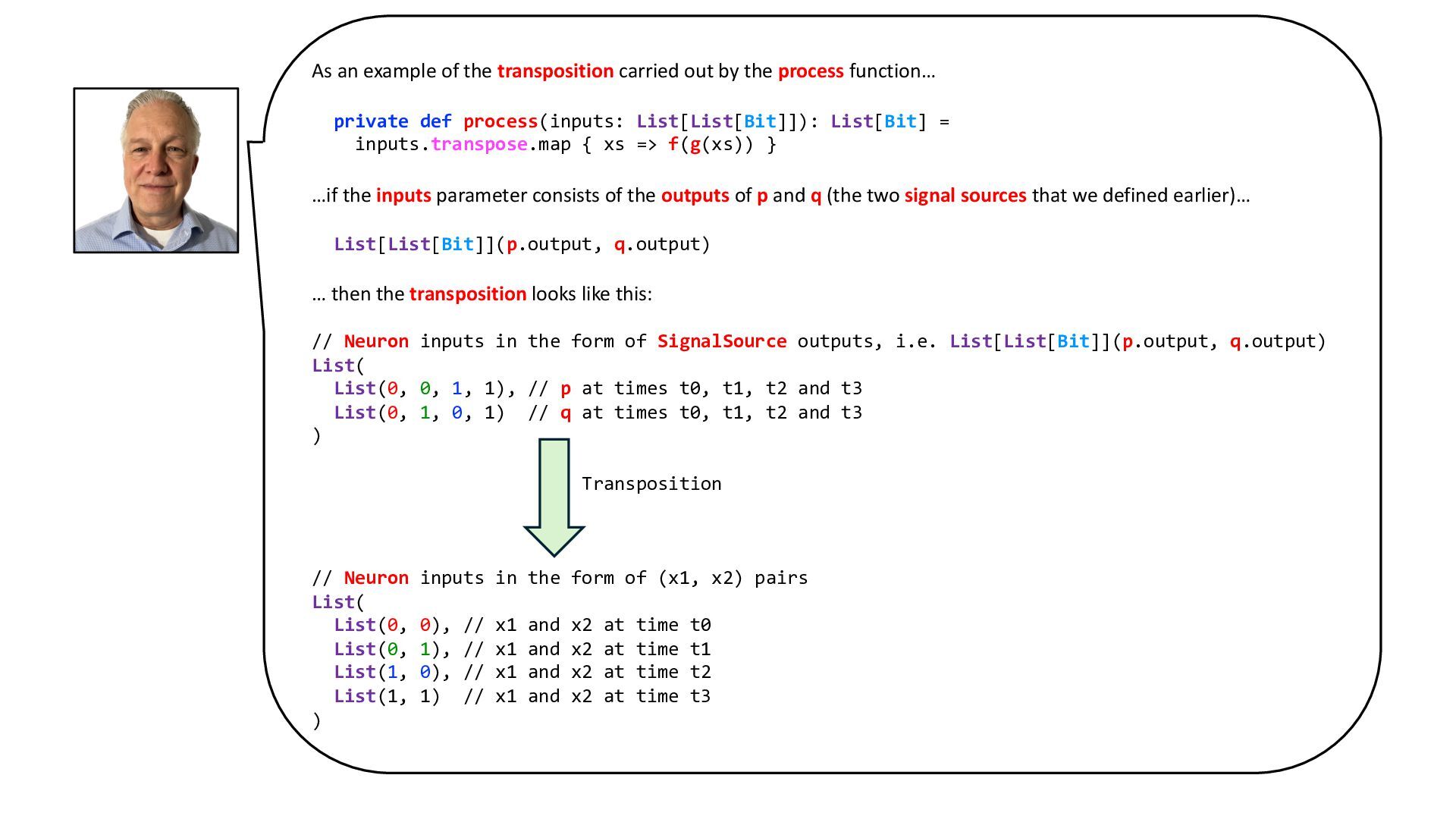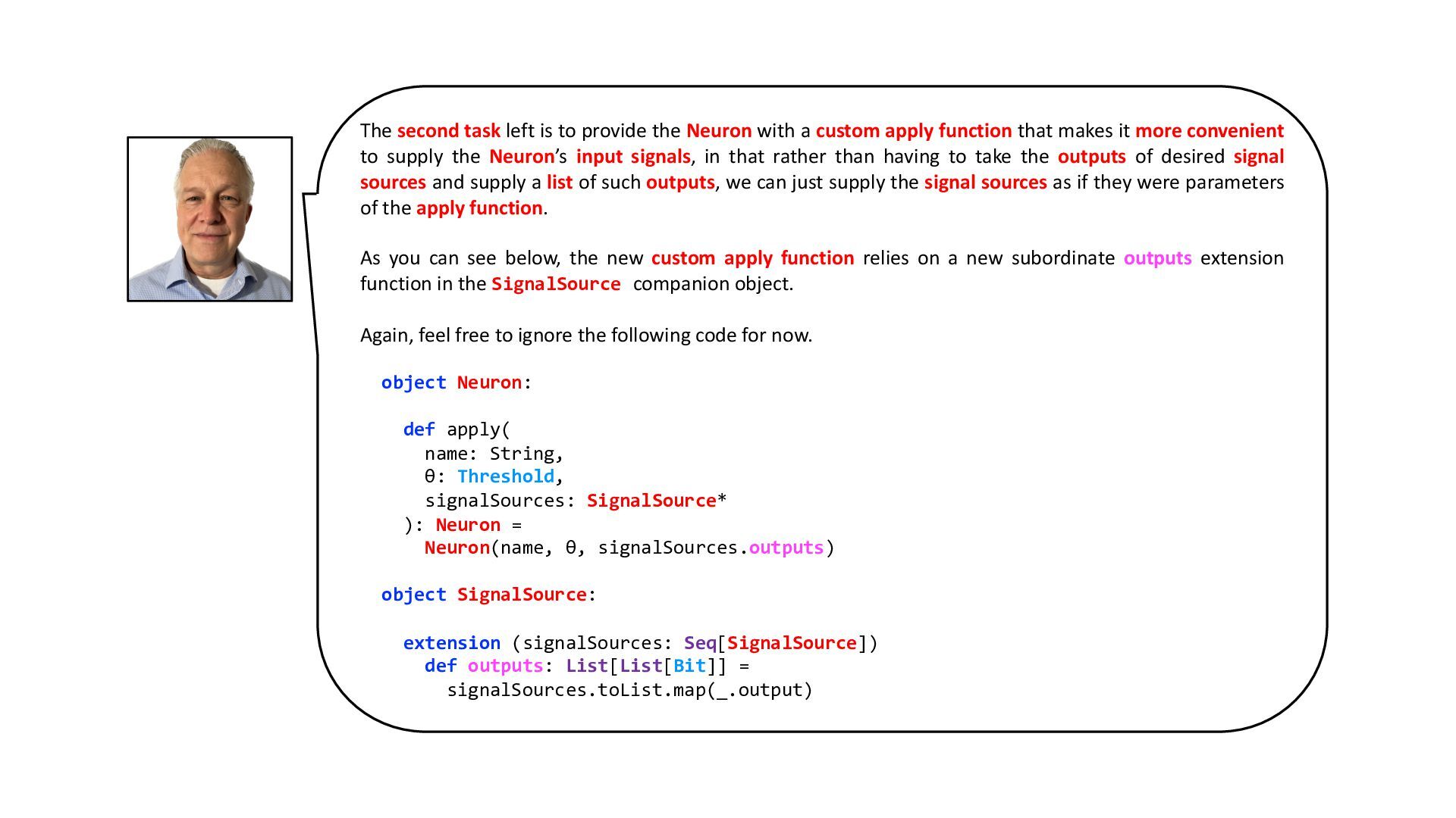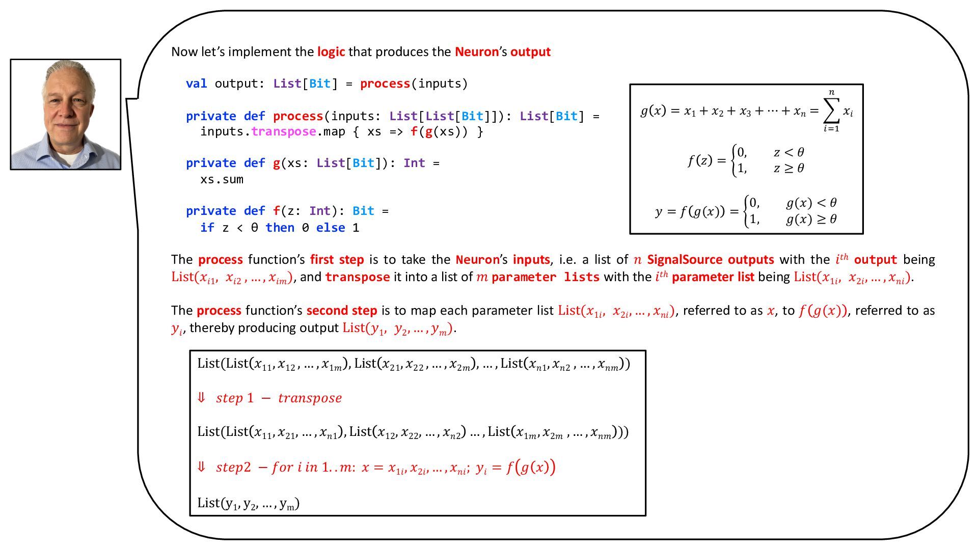 val output: List[Bit] = process(inputs) private def process(inputs: List[List[Bit]]): List[Bit] = inputs.transpose.map { xs => f(g(xs)) } private def g(xs: List[Bit]): Int = xs.sum private def f(z: Int): Bit = if z < ฮธ then 0 else 1 The process functionโs first step is to take the Neuronโs inputs, i.e. a list of ๐ SignalSource outputs with the ๐๐กโ output being List(๐ฅ๐1 , ๐ฅ๐2 , โฆ , ๐ฅ๐๐ ), and transpose it into a list of ๐ parameter lists with the ๐๐กโ parameter list being List(๐ฅ1๐ , ๐ฅ2๐ , โฆ , ๐ฅ๐๐ ). The process functionโs second step is to map each parameter list List(๐ฅ1๐ , ๐ฅ2๐ , โฆ , ๐ฅ๐๐ ), referred to as ๐ฅ, to ๐ ๐(๐ฅ) , referred to as ๐ฆ๐ , thereby producing output List(๐ฆ1 , ๐ฆ2 , โฆ , ๐ฆ๐ ). ๐ ๐ฅ = ๐ฅ1 + ๐ฅ2 + ๐ฅ3 + โฏ + ๐ฅ๐ = & )*+ , ๐ฅ๐ ๐ ๐ง = ) 0, ๐ง < ๐ 1, ๐ง โฅ ๐ ๐ฆ = ๐ ๐(๐ฅ) = ) 0, ๐(๐ฅ) < ๐ 1, ๐(๐ฅ) โฅ ๐ List(List ๐ฅ11 , ๐ฅ12 , โฆ , ๐ฅ1๐ , List ๐ฅ21 , ๐ฅ22 , โฆ , ๐ฅ2๐ , โฆ , List ๐ฅ๐1 , ๐ฅ๐2 , โฆ , ๐ฅ๐๐ ) โ ๐ ๐ก๐๐ 1 โ ๐ก๐๐๐๐ ๐๐๐ ๐ List(List ๐ฅ11 , ๐ฅ21 , โฆ , ๐ฅ๐1 , List ๐ฅ12 , ๐ฅ22 , โฆ , ๐ฅ๐2 โฆ , List ๐ฅ1๐ , ๐ฅ2๐ , โฆ , ๐ฅ๐๐ )) โ ๐ ๐ก๐๐2 โ ๐๐๐ ๐ ๐๐ 1. . ๐: ๐ฅ = ๐ฅ1๐ , ๐ฅ2๐ , โฆ , ๐ฅ๐๐ ; ๐ฆ๐ = ๐ ๐ ๐ฅ List(y1 , y2 , โฆ , ym )