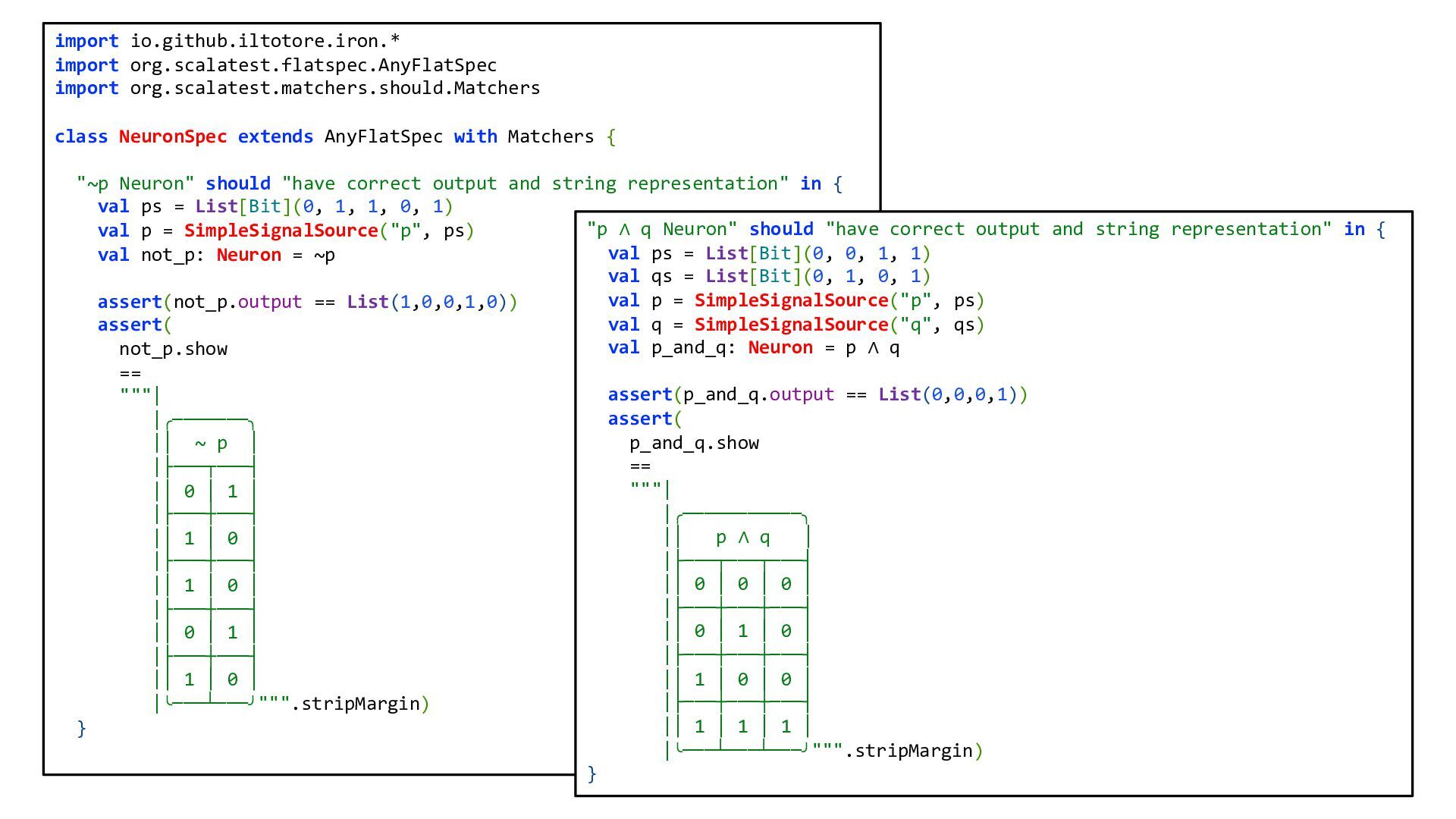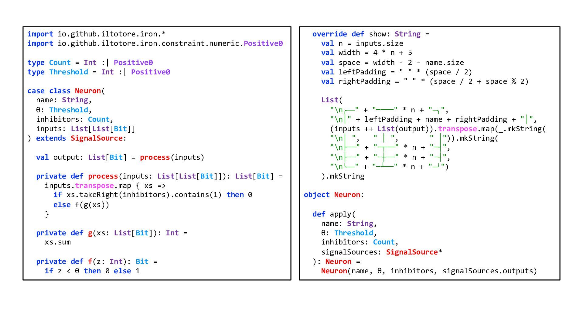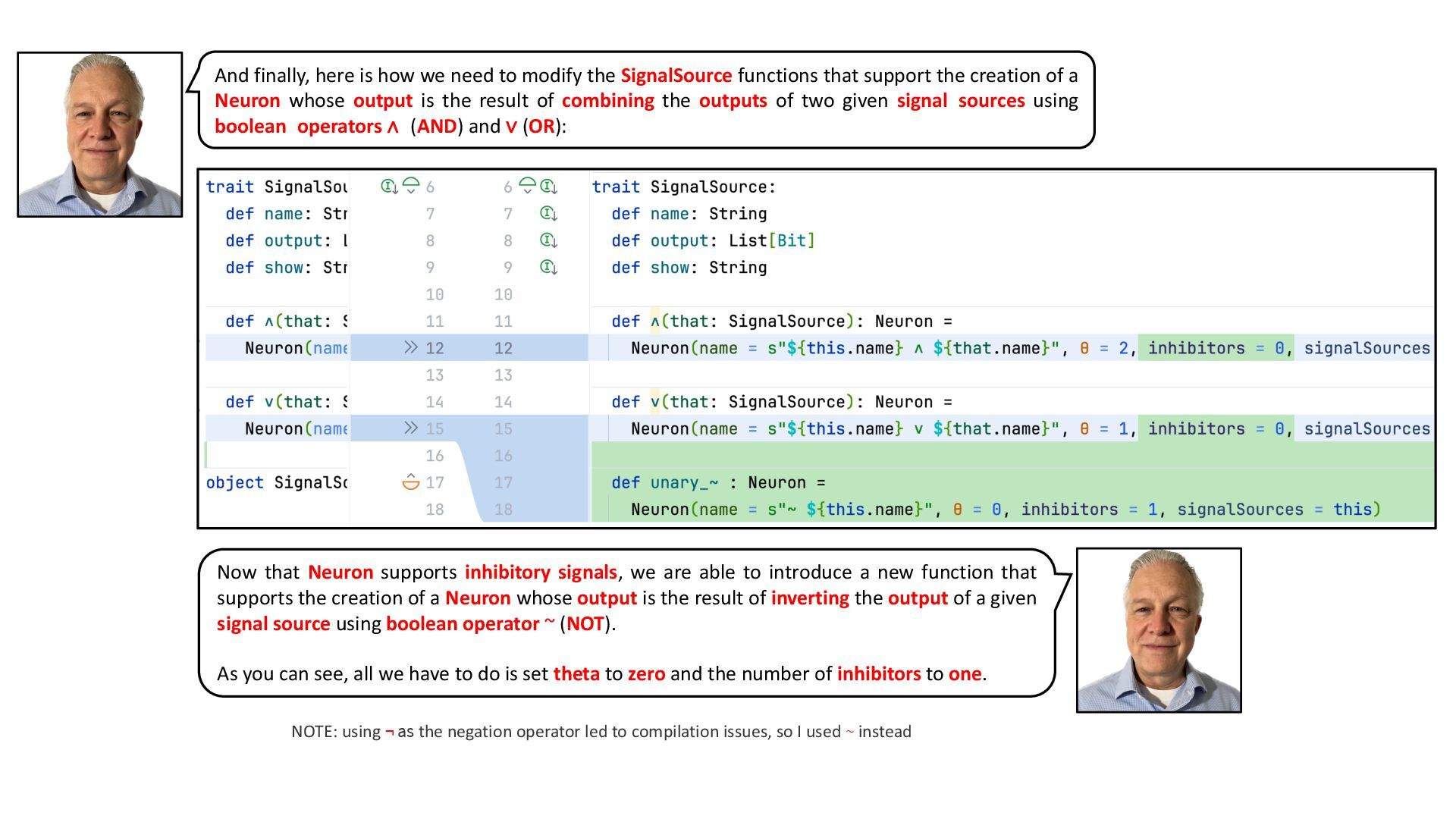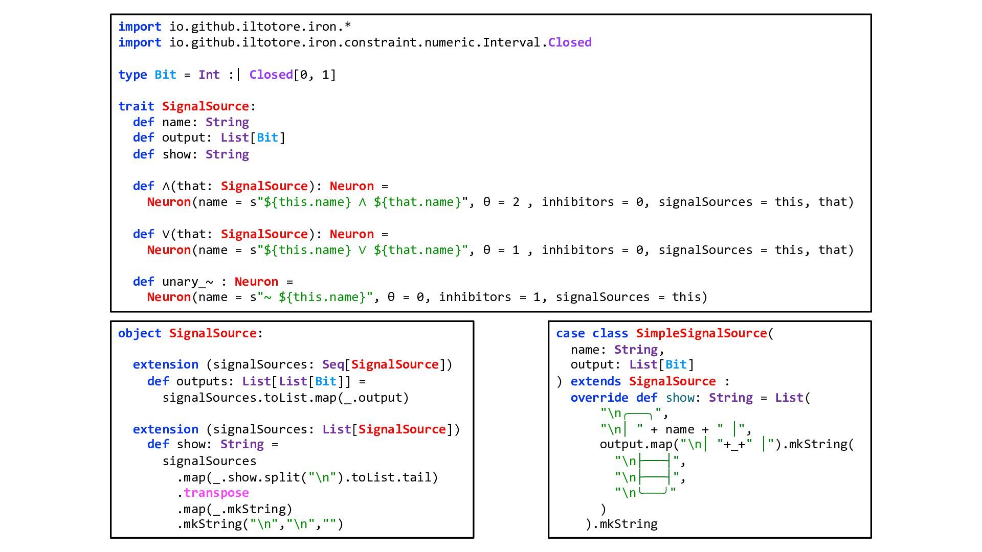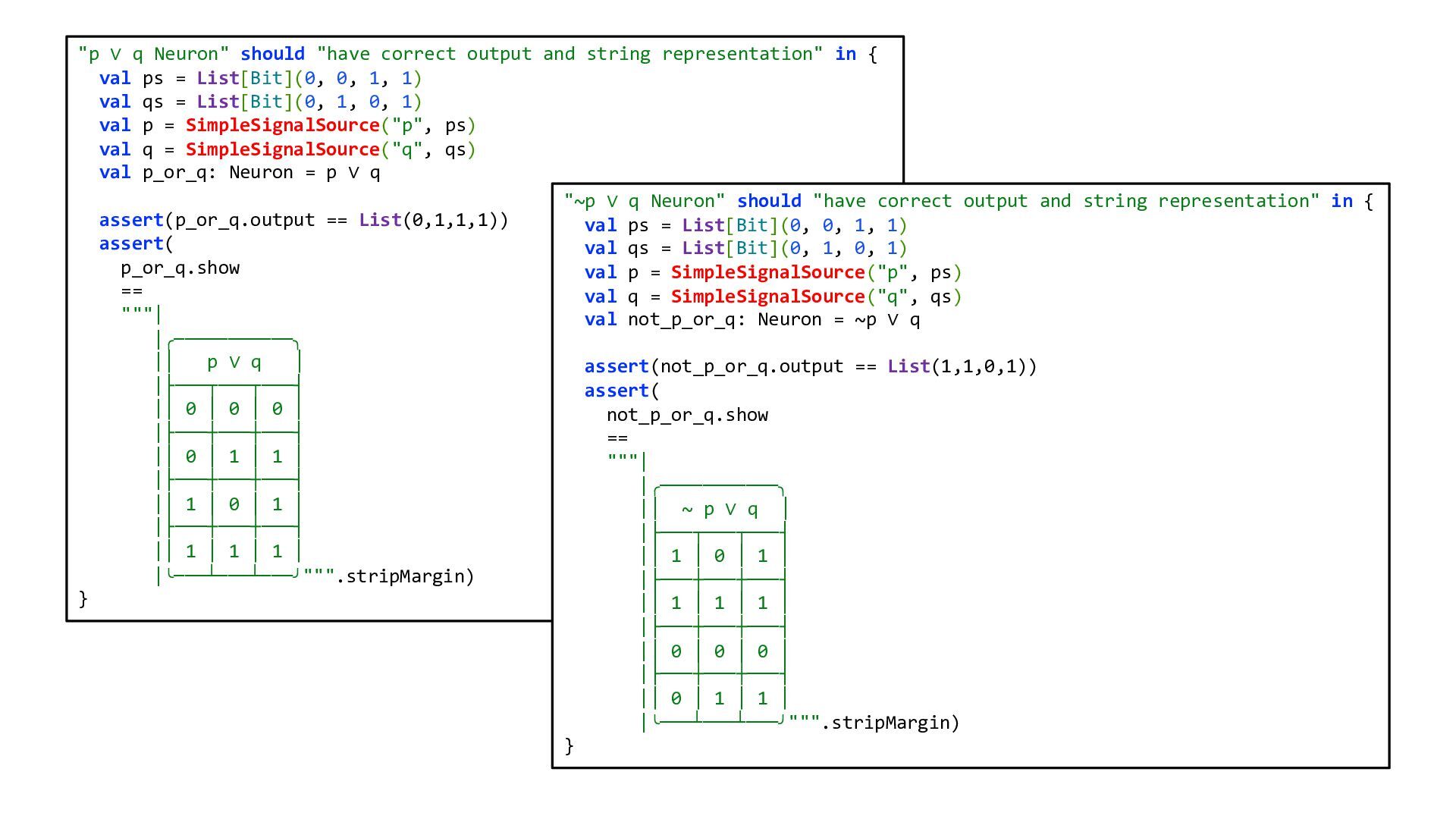 val output: List[Bit] = process(inputs) private def process(inputs: List[List[Bit]]): List[Bit] = inputs.transpose.map { xs => f(g(xs)) } private def g(xs: List[Bit]): Int = xs.sum private def f(z: Int): Bit = if z < ฮธ then 0 else 1 The process functionโs first step is to take the Neuronโs inputs, i.e. a list of ๐ SignalSource outputs with the ๐๐กโ output being List(๐ฅ๐1 , ๐ฅ๐2 , โฆ , ๐ฅ๐๐ ), and transpose it into a list of ๐ parameter lists with the ๐๐กโ parameter list being List(๐ฅ1๐ , ๐ฅ2๐ , โฆ , ๐ฅ๐๐ ). The process functionโs second step is to map each parameter list List(๐ฅ1๐ , ๐ฅ2๐ , โฆ , ๐ฅ๐๐ ), referred to as ๐ฅ, to ๐ ๐(๐ฅ) , referred to as ๐ฆ๐ , thereby producing output List(๐ฆ1 , ๐ฆ2 , โฆ , ๐ฆ๐ ). ๐ ๐ฅ = ๐ฅ1 + ๐ฅ2 + ๐ฅ3 + โฏ + ๐ฅ๐ = & )*+ , ๐ฅ๐ ๐ ๐ง = ) 0, ๐ง < ๐ 1, ๐ง โฅ ๐ ๐ฆ = ๐ ๐(๐ฅ) = ) 0, ๐(๐ฅ) < ๐ 1, ๐(๐ฅ) โฅ ๐ List(List ๐ฅ11 , ๐ฅ12 , โฆ , ๐ฅ1๐ , List ๐ฅ21 , ๐ฅ22 , โฆ , ๐ฅ2๐ , โฆ , List ๐ฅ๐1 , ๐ฅ๐2 , โฆ , ๐ฅ๐๐ ) โ ๐ ๐ก๐๐ 1 โ ๐ก๐๐๐๐ ๐๐๐ ๐ List(List ๐ฅ11 , ๐ฅ21 , โฆ , ๐ฅ๐1 , List ๐ฅ12 , ๐ฅ22 , โฆ , ๐ฅ๐2 โฆ , List ๐ฅ1๐ , ๐ฅ2๐ , โฆ , ๐ฅ๐๐ )) โ ๐ ๐ก๐๐2 โ ๐๐๐ ๐ ๐๐ 1. . ๐: ๐ฅ = ๐ฅ1๐ , ๐ฅ2๐ , โฆ , ๐ฅ๐๐ ; ๐ฆ๐ = ๐ ๐ ๐ฅ List(y1 , y2 , โฆ , ym )