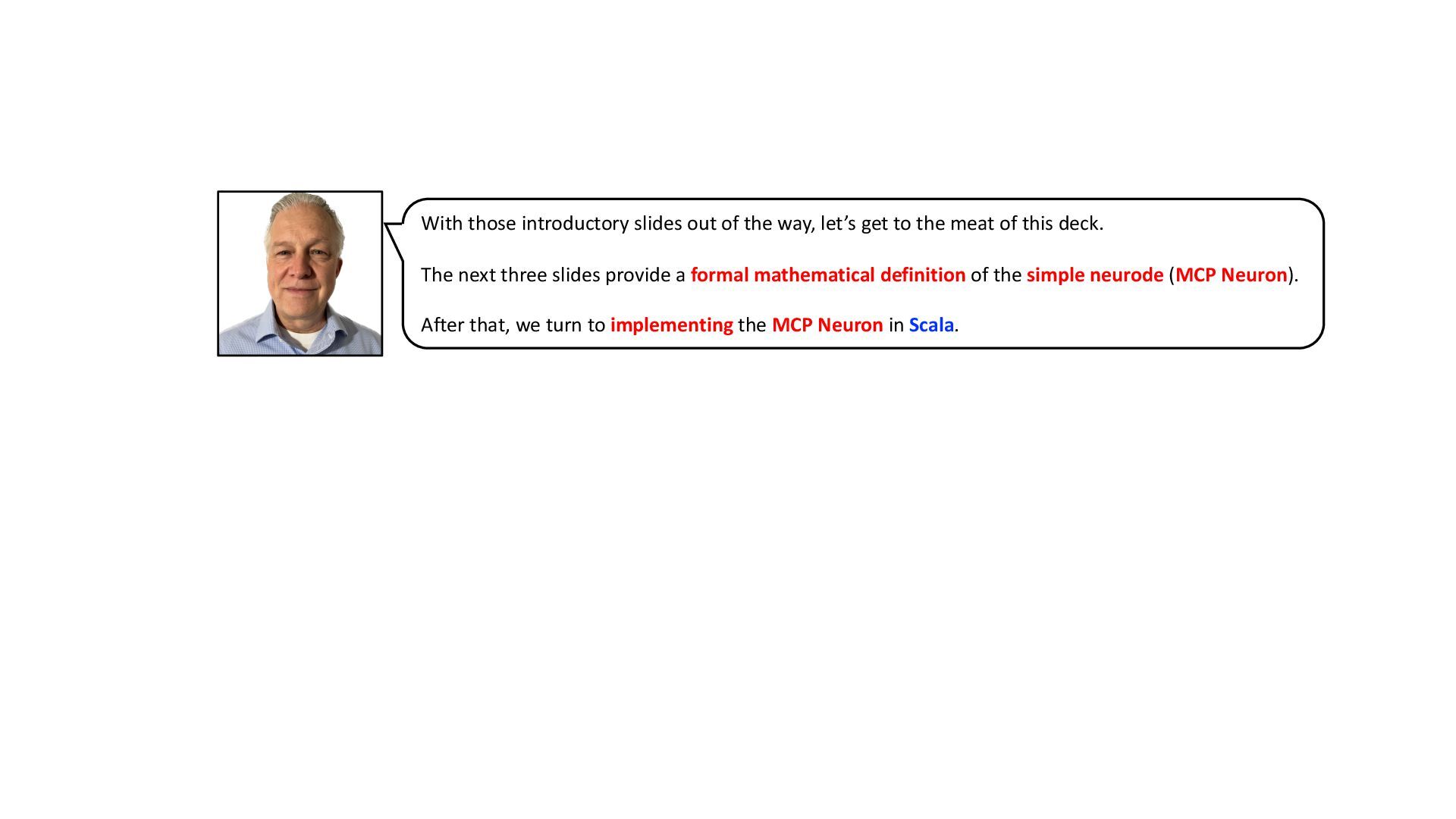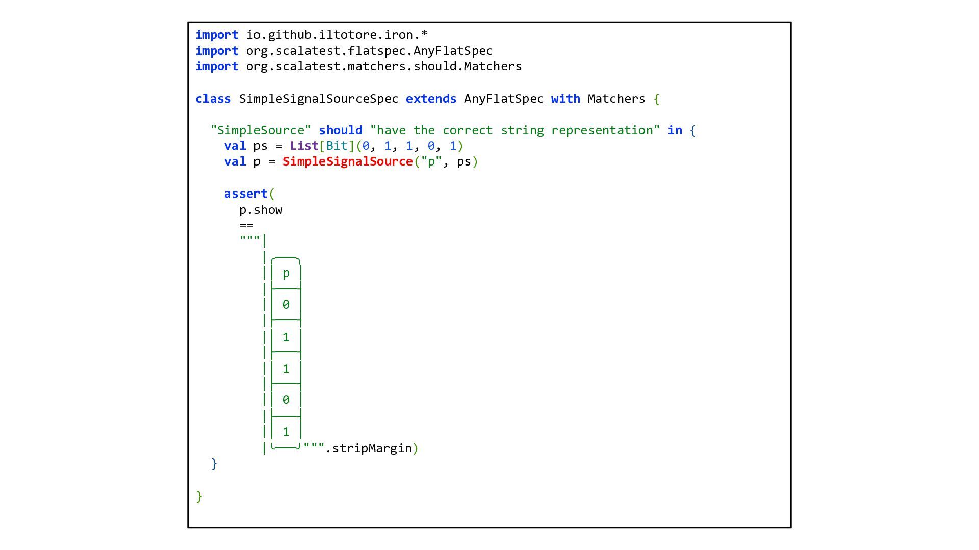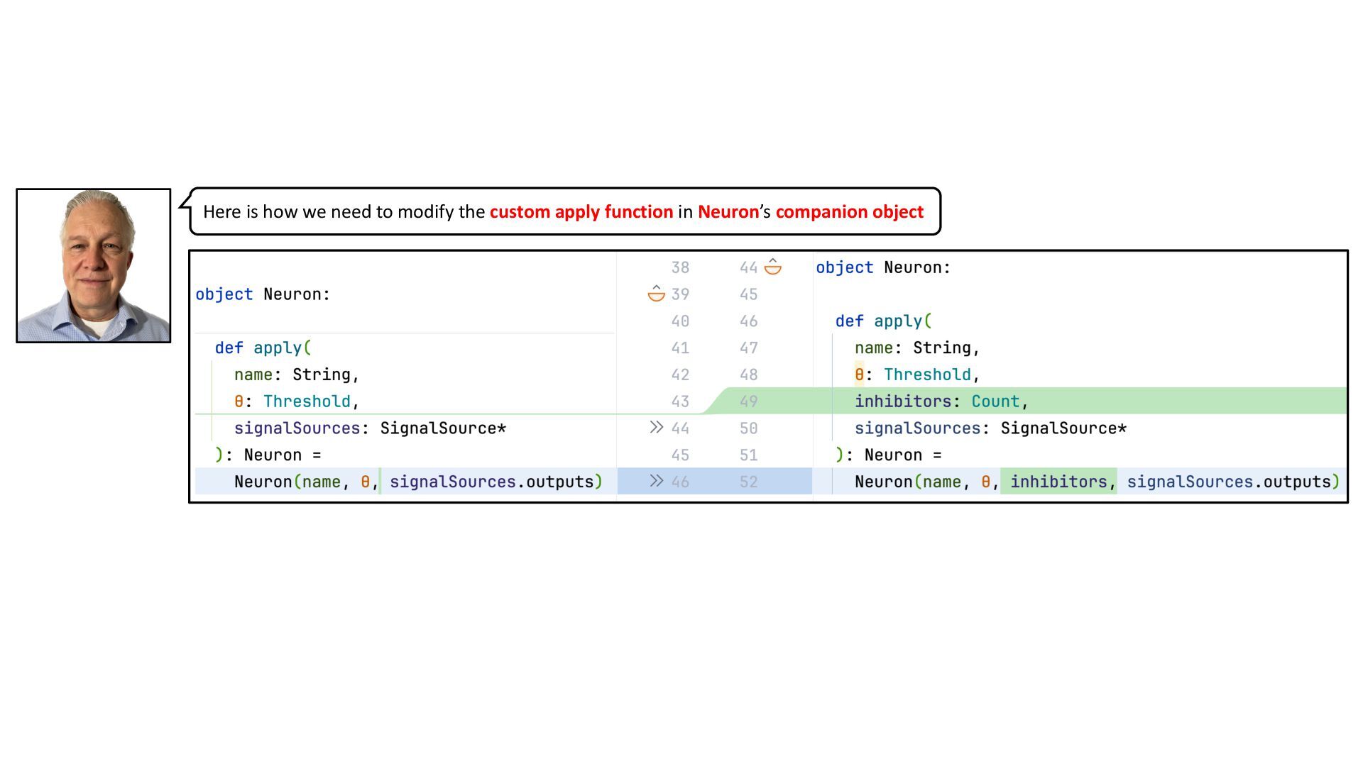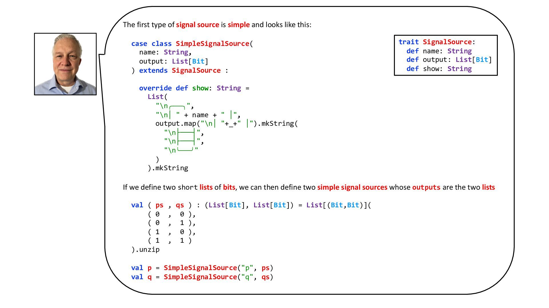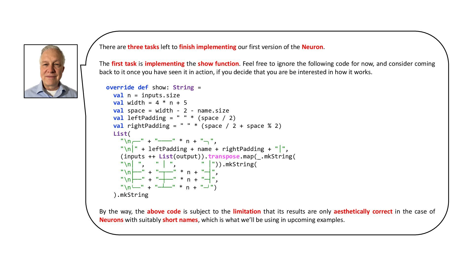 val output: List[Bit] = process(inputs) private def process(inputs: List[List[Bit]]): List[Bit] = inputs.transpose.map { xs => f(g(xs)) } private def g(xs: List[Bit]): Int = xs.sum private def f(z: Int): Bit = if z < ฮธ then 0 else 1 The process functionโs first step is to take the Neuronโs inputs, i.e. a list of ๐ SignalSource outputs with the ๐๐กโ output being List(๐ฅ๐1 , ๐ฅ๐2 , โฆ , ๐ฅ๐๐ ), and transpose it into a list of ๐ parameter lists with the ๐๐กโ parameter list being List(๐ฅ1๐ , ๐ฅ2๐ , โฆ , ๐ฅ๐๐ ). The process functionโs second step is to map each parameter list List(๐ฅ1๐ , ๐ฅ2๐ , โฆ , ๐ฅ๐๐ ), referred to as ๐ฅ, to ๐ ๐(๐ฅ) , referred to as ๐ฆ๐ , thereby producing output List(๐ฆ1 , ๐ฆ2 , โฆ , ๐ฆ๐ ). ๐ ๐ฅ = ๐ฅ1 + ๐ฅ2 + ๐ฅ3 + โฏ + ๐ฅ๐ = & )*+ , ๐ฅ๐ ๐ ๐ง = ) 0, ๐ง < ๐ 1, ๐ง โฅ ๐ ๐ฆ = ๐ ๐(๐ฅ) = ) 0, ๐(๐ฅ) < ๐ 1, ๐(๐ฅ) โฅ ๐ List(List ๐ฅ11 , ๐ฅ12 , โฆ , ๐ฅ1๐ , List ๐ฅ21 , ๐ฅ22 , โฆ , ๐ฅ2๐ , โฆ , List ๐ฅ๐1 , ๐ฅ๐2 , โฆ , ๐ฅ๐๐ ) โ ๐ ๐ก๐๐ 1 โ ๐ก๐๐๐๐ ๐๐๐ ๐ List(List ๐ฅ11 , ๐ฅ21 , โฆ , ๐ฅ๐1 , List ๐ฅ12 , ๐ฅ22 , โฆ , ๐ฅ๐2 โฆ , List ๐ฅ1๐ , ๐ฅ2๐ , โฆ , ๐ฅ๐๐ )) โ ๐ ๐ก๐๐2 โ ๐๐๐ ๐ ๐๐ 1. . ๐: ๐ฅ = ๐ฅ1๐ , ๐ฅ2๐ , โฆ , ๐ฅ๐๐ ; ๐ฆ๐ = ๐ ๐ ๐ฅ List(y1 , y2 , โฆ , ym )