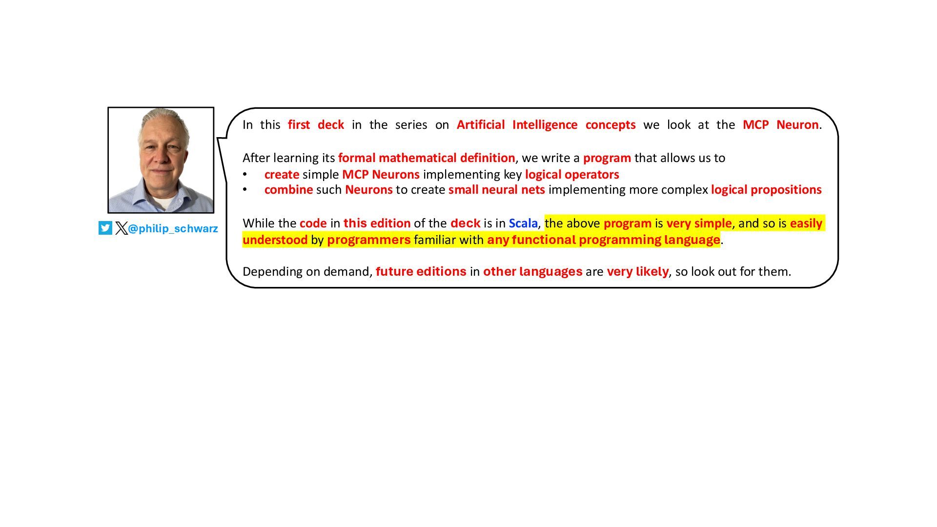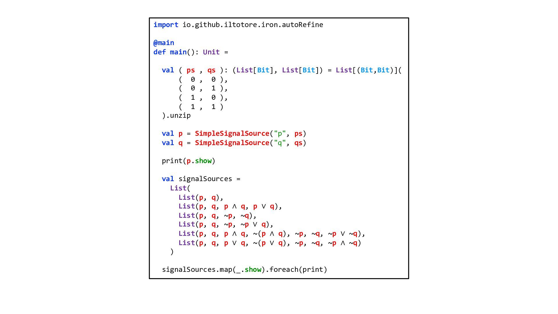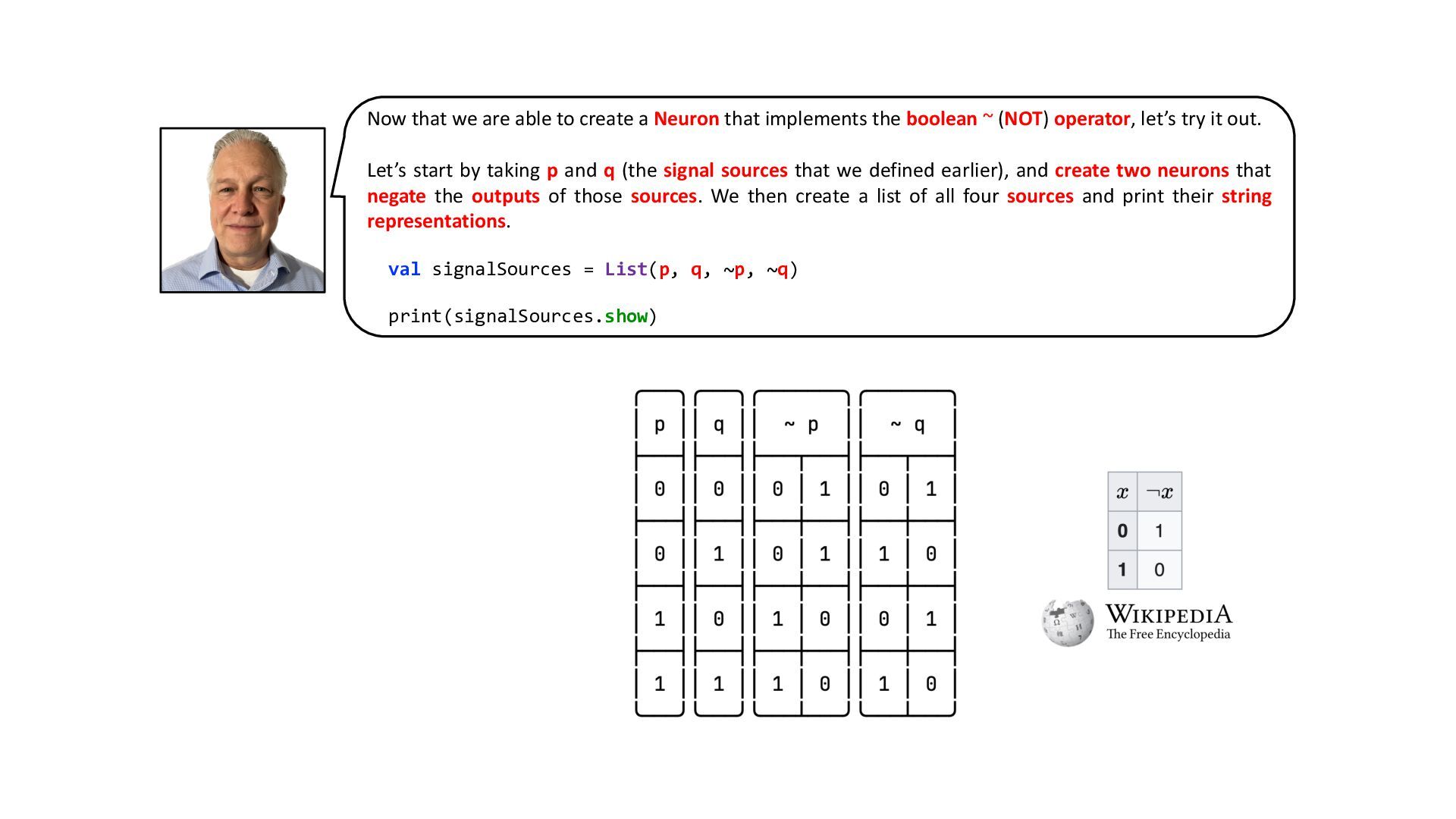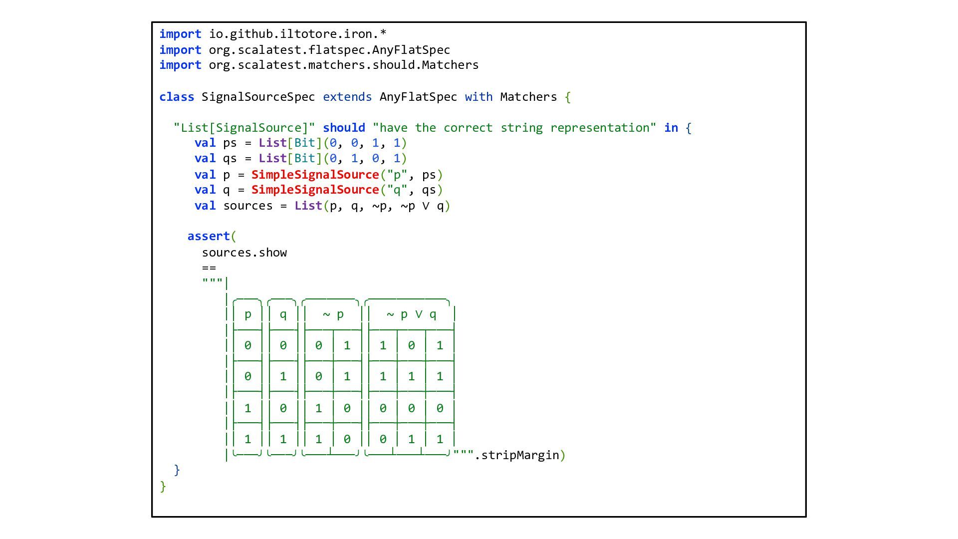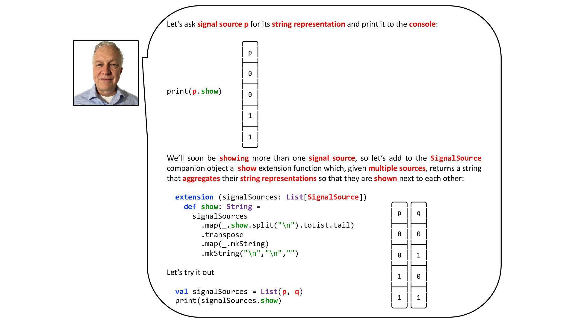 val output: List[Bit] = process(inputs) private def process(inputs: List[List[Bit]]): List[Bit] = inputs.transpose.map { xs => f(g(xs)) } private def g(xs: List[Bit]): Int = xs.sum private def f(z: Int): Bit = if z < ฮธ then 0 else 1 The process functionโs first step is to take the Neuronโs inputs, i.e. a list of ๐ SignalSource outputs with the ๐๐กโ output being List(๐ฅ๐1 , ๐ฅ๐2 , โฆ , ๐ฅ๐๐ ), and transpose it into a list of ๐ parameter lists with the ๐๐กโ parameter list being List(๐ฅ1๐ , ๐ฅ2๐ , โฆ , ๐ฅ๐๐ ). The process functionโs second step is to map each parameter list List(๐ฅ1๐ , ๐ฅ2๐ , โฆ , ๐ฅ๐๐ ), referred to as ๐ฅ, to ๐ ๐(๐ฅ) , referred to as ๐ฆ๐ , thereby producing output List(๐ฆ1 , ๐ฆ2 , โฆ , ๐ฆ๐ ). ๐ ๐ฅ = ๐ฅ1 + ๐ฅ2 + ๐ฅ3 + โฏ + ๐ฅ๐ = & )*+ , ๐ฅ๐ ๐ ๐ง = ) 0, ๐ง < ๐ 1, ๐ง โฅ ๐ ๐ฆ = ๐ ๐(๐ฅ) = ) 0, ๐(๐ฅ) < ๐ 1, ๐(๐ฅ) โฅ ๐ List(List ๐ฅ11 , ๐ฅ12 , โฆ , ๐ฅ1๐ , List ๐ฅ21 , ๐ฅ22 , โฆ , ๐ฅ2๐ , โฆ , List ๐ฅ๐1 , ๐ฅ๐2 , โฆ , ๐ฅ๐๐ ) โ ๐ ๐ก๐๐ 1 โ ๐ก๐๐๐๐ ๐๐๐ ๐ List(List ๐ฅ11 , ๐ฅ21 , โฆ , ๐ฅ๐1 , List ๐ฅ12 , ๐ฅ22 , โฆ , ๐ฅ๐2 โฆ , List ๐ฅ1๐ , ๐ฅ2๐ , โฆ , ๐ฅ๐๐ )) โ ๐ ๐ก๐๐2 โ ๐๐๐ ๐ ๐๐ 1. . ๐: ๐ฅ = ๐ฅ1๐ , ๐ฅ2๐ , โฆ , ๐ฅ๐๐ ; ๐ฆ๐ = ๐ ๐ ๐ฅ List(y1 , y2 , โฆ , ym )