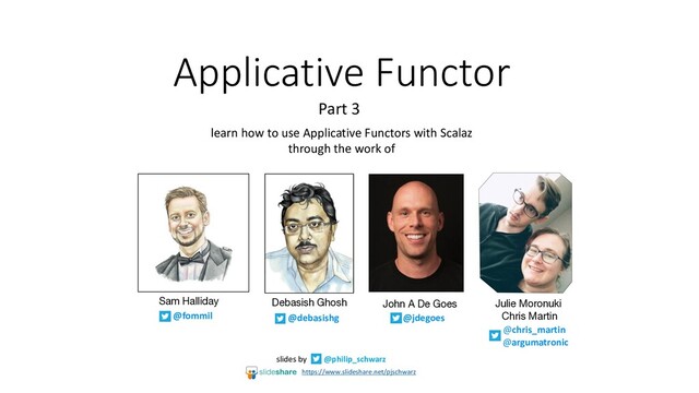 so on, and the pattern is straightforward. Implement map3 and map4 using only unit, apply, and the curried method available on functions. def map3[A,B,C,D](fa: F[A],fb: F[B],fc: F[C]) (f: (A, B, C) => D): F[D] def map4[A,B,C,D,E](fa: F[A],fb: F[B],fc: F[C],fd: F[D]) (f: (A, B, C, D) => E): F[E] … consider a web form that requires a name, a birth date, and a phone number: case class WebForm(name: String, birthdate: Date, phoneNumber: String) …to validate an entire web form, we can simply lift the WebForm constructor with map3: def validWebForm(name: String, birthdate: String, phone: String): Validation[String, WebForm] = map3( validName(name), validBirthdate(birthdate), validPhone(phone))( WebForm(_,_,_)) If any or all of the functions produce Failure, the whole validWebForm method will return all of those failures combined. After you invoke all three of the validation functions, you get three instances of V[_]. If all of them indicate a successful validation, you extract the validated arguments and pass them to a function, f, that constructs the final validated object. In case of failure, you report errors to the client. This gives the following contract for the workflow—let’s call it apply3 You don’t yet have the implementation of apply3. But assuming you have one, let’s see how the validation code evolves out of this algebra and plugs into the smart constructor for creating a SavingsAccount: Another reminder that in FP in Scala, Scalaz‘s apply2, apply3, apply4, etc are called map2, map3, map4, etc. This slide also reminds us of examples that we have already seen of one of the two most important uses that Sam Halliday attributes to functions apply2, apply3, etc, i.e. ‘constructing some typeclasses for a product type C from its constituents A and B’ Scalaz‘s apply2, apply3, apply4, etc are called the same in Functional and Reactive Domain Modeling