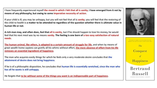felt that all is vanity; I have emerged from it not by means of any philosophy, but owing to some imperative necessity of action. If your child is ill, you may be unhappy, but you will not feel that all is vanity; you will feel that the restoring of the child to health is a matter to be attended to regardless of the question whether there is ultimate value in human life or not. A rich man may, and often does, feel that all is vanity, but if he should happen to lose his money, he would feel that his next meal was by no means vanity. The feeling is one born of a too easy satisfaction of natural needs. The human animal, like others, is adapted to a certain amount of struggle for life, and when by means of great wealth homo sapiens can gratify all his whims without effort, the mere absence of effort from his life removes an essential ingredient of happiness. The man who acquires easily things for which he feels only a very moderate desire concludes that the attainment of desire does not bring happiness. If he is of a philosophic disposition, he concludes that human life is essentially wretched, since the man who has all he wants is still unhappy. He forgets that to be without some of the things you want is an indispensable part of happiness.