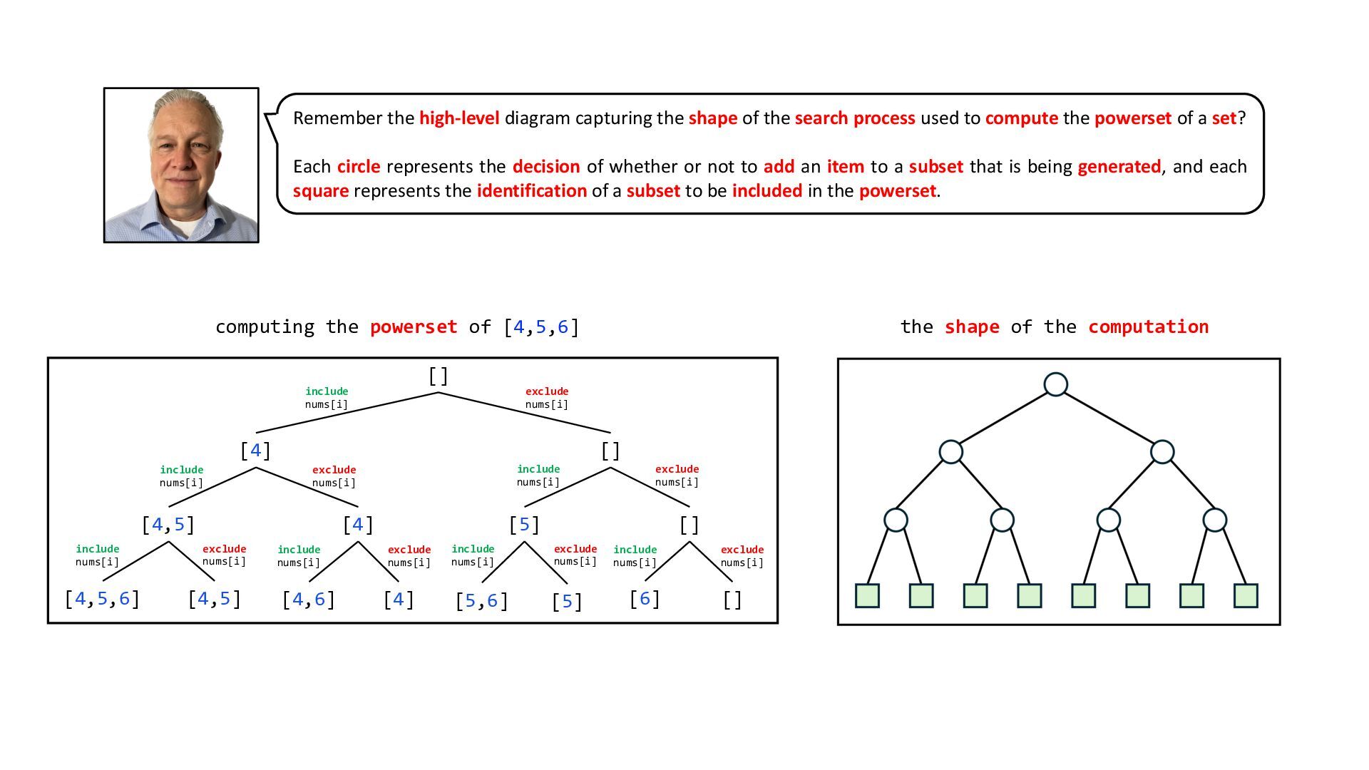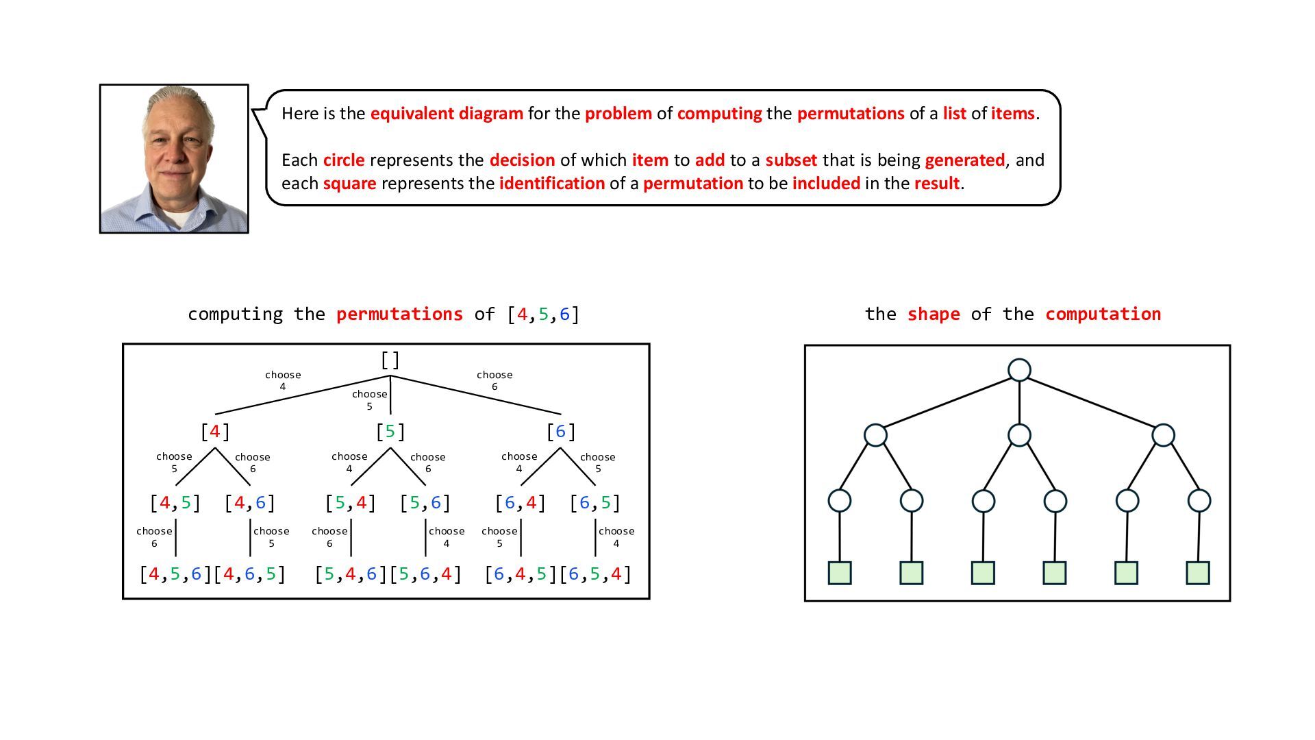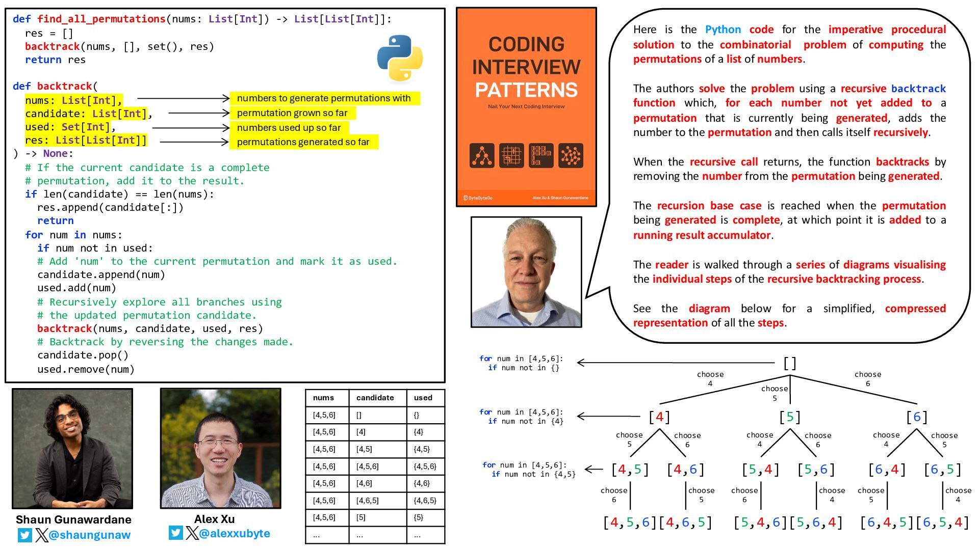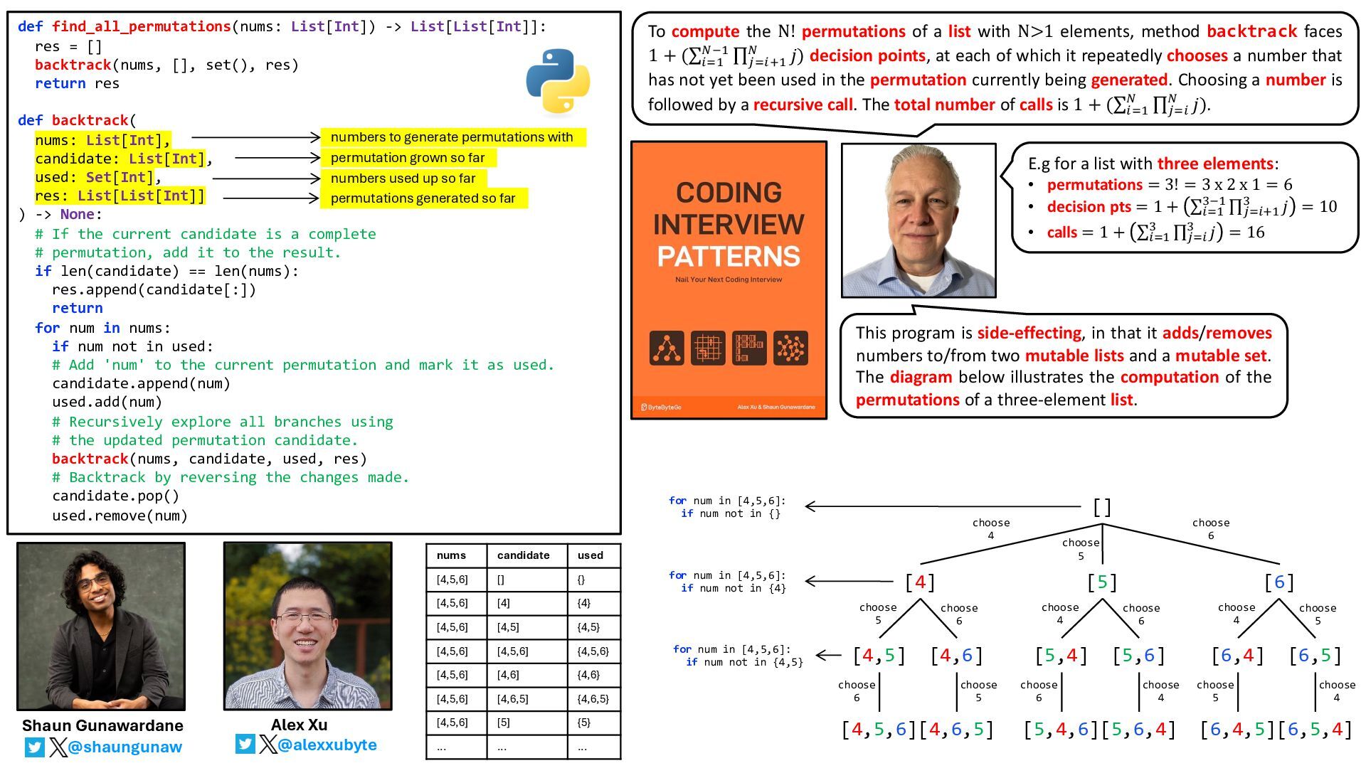 elements, method backtrack faces 1 + (∑ !"# $%# ∏ &"!'# $ 𝑗) decision points, at each of which it repeatedly chooses a number that has not yet been used in the permutation currently being generated. Choosing a number is followed by a recursive call. The total number of calls is 1 + (∑!"# $ ∏&"! $ 𝑗). def find_all_permutations(nums: List[Int]) -> List[List[Int]]: res = [] backtrack(nums, [], set(), res) return res def backtrack( nums: List[Int], candidate: List[Int], used: Set[Int], res: List[List[Int]] ) -> None: # If the current candidate is a complete # permutation, add it to the result. if len(candidate) == len(nums): res.append(candidate[:]) return for num in nums: if num not in used: # Add 'num' to the current permutation and mark it as used. candidate.append(num) used.add(num) # Recursively explore all branches using # the updated permutation candidate. backtrack(nums, candidate, used, res) # Backtrack by reversing the changes made. candidate.pop() used.remove(num) @alexxubyte Alex Xu @shaungunaw Shaun Gunawardane numbers to generate permutations with permutation grown so far numbers used up so far permutations generated so far This program is side-effecting, in that it adds/removes numbers to/from two mutable lists and a mutable set. The diagram below illustrates the computation of the permutations of a three-element list. E.g for a list with three elements: • permutations = 3! = 3 x 2 x 1 = 6 • decision pts = 1 + ∑!"# (%# ∏&"!'# ( 𝑗 = 10 • calls = 1 + ∑!"# ( ∏&"! ( 𝑗 = 16 [] [4] [6] [4,5] [4,6] [4,5,6][4,6,5] choose 4 choose 6 choose 5 choose 6 choose 6 choose 5 [5] [5,4] [5,6] [5,4,6][5,6,4] choose 4 choose 6 choose 6 choose 4 [6,4] [6,5] [6,4,5][6,5,4] choose 4 choose 5 choose 5 choose 4 choose 5 nums candidate used [4,5,6] [] {} [4,5,6] [4] {4} [4,5,6] [4,5] {4,5} [4,5,6] [4,5,6] {4,5,6} [4,5,6] [4,6] {4,6} [4,5,6] [4,6,5] {4,6,5} [4,5,6] [5] {5} … … … for num in [4,5,6]: if num not in {} for num in [4,5,6]: if num not in {4} for num in [4,5,6]: if num not in {4,5}