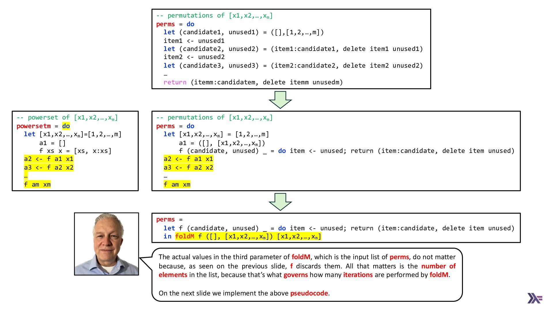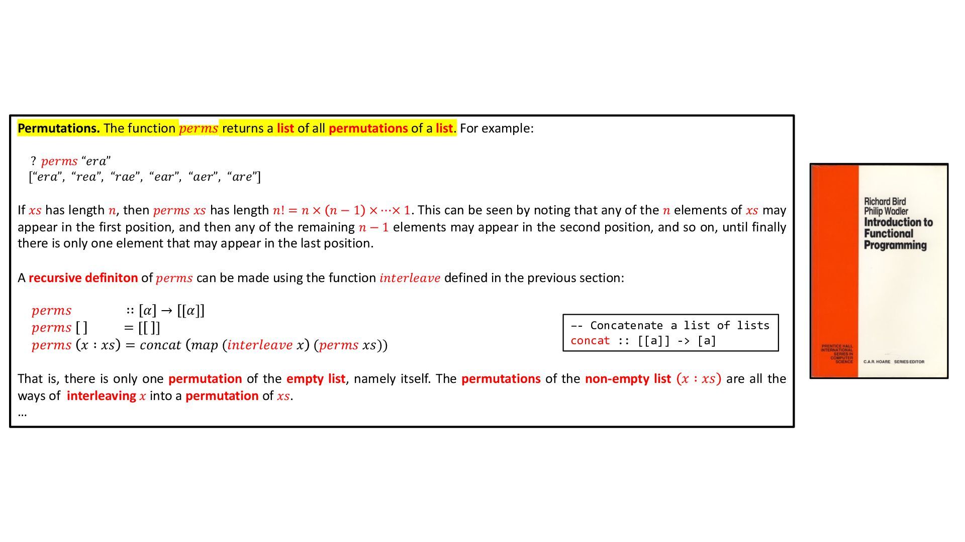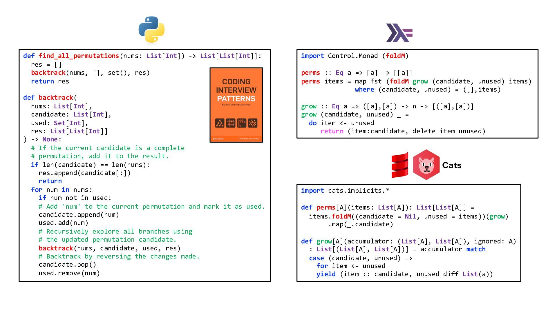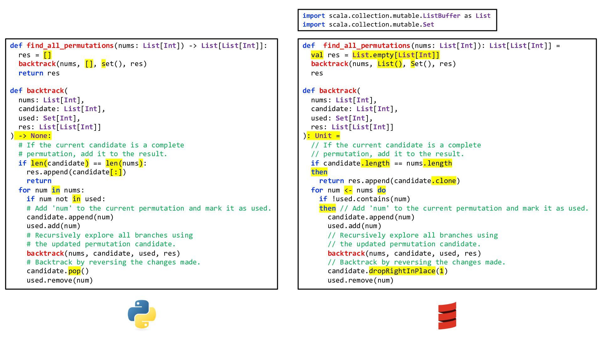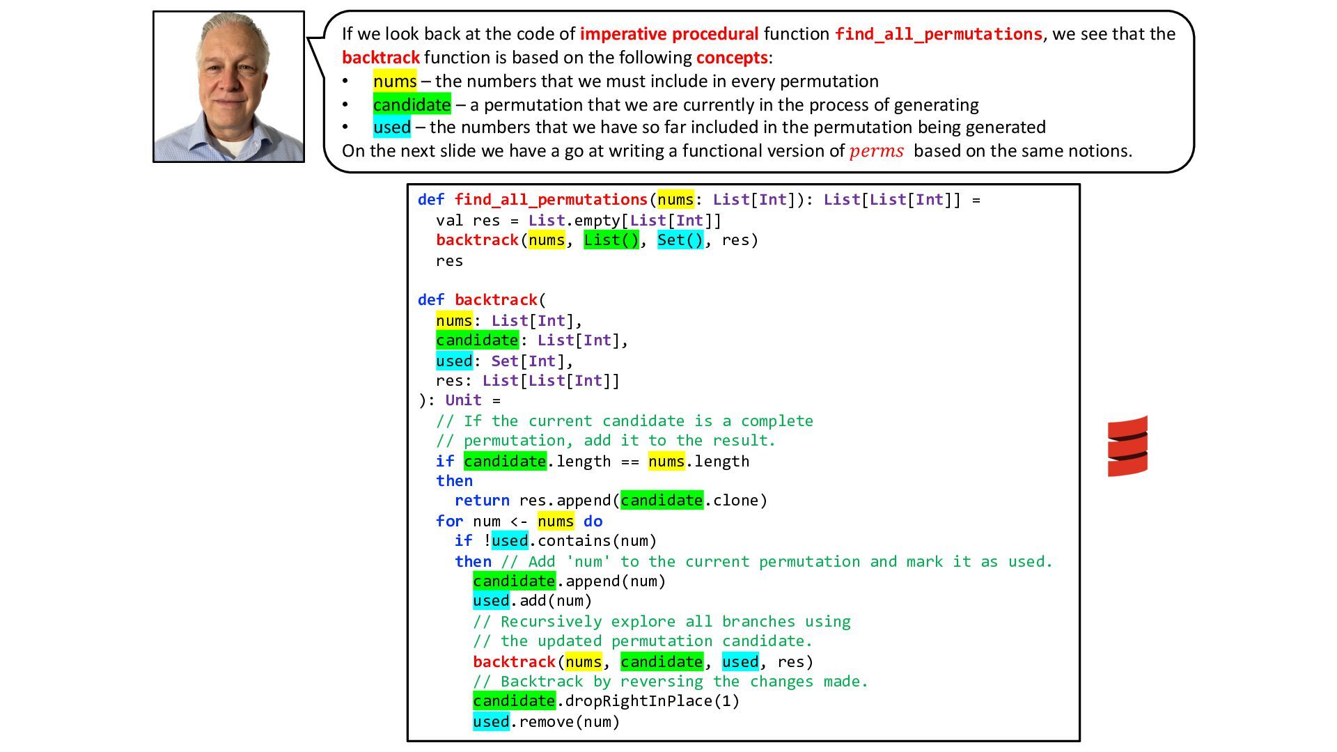 elements, method backtrack faces 1 + (∑ !"# $%# ∏ &"!'# $ 𝑗) decision points, at each of which it repeatedly chooses a number that has not yet been used in the permutation currently being generated. Choosing a number is followed by a recursive call. The total number of calls is 1 + (∑!"# $ ∏&"! $ 𝑗). def find_all_permutations(nums: List[Int]) -> List[List[Int]]: res = [] backtrack(nums, [], set(), res) return res def backtrack( nums: List[Int], candidate: List[Int], used: Set[Int], res: List[List[Int]] ) -> None: # If the current candidate is a complete # permutation, add it to the result. if len(candidate) == len(nums): res.append(candidate[:]) return for num in nums: if num not in used: # Add 'num' to the current permutation and mark it as used. candidate.append(num) used.add(num) # Recursively explore all branches using # the updated permutation candidate. backtrack(nums, candidate, used, res) # Backtrack by reversing the changes made. candidate.pop() used.remove(num) @alexxubyte Alex Xu @shaungunaw Shaun Gunawardane numbers to generate permutations with permutation grown so far numbers used up so far permutations generated so far This program is side-effecting, in that it adds/removes numbers to/from two mutable lists and a mutable set. The diagram below illustrates the computation of the permutations of a three-element list. E.g for a list with three elements: • permutations = 3! = 3 x 2 x 1 = 6 • decision pts = 1 + ∑!"# (%# ∏&"!'# ( 𝑗 = 10 • calls = 1 + ∑!"# ( ∏&"! ( 𝑗 = 16 [] [4] [6] [4,5] [4,6] [4,5,6][4,6,5] choose 4 choose 6 choose 5 choose 6 choose 6 choose 5 [5] [5,4] [5,6] [5,4,6][5,6,4] choose 4 choose 6 choose 6 choose 4 [6,4] [6,5] [6,4,5][6,5,4] choose 4 choose 5 choose 5 choose 4 choose 5 nums candidate used [4,5,6] [] {} [4,5,6] [4] {4} [4,5,6] [4,5] {4,5} [4,5,6] [4,5,6] {4,5,6} [4,5,6] [4,6] {4,6} [4,5,6] [4,6,5] {4,6,5} [4,5,6] [5] {5} … … … for num in [4,5,6]: if num not in {} for num in [4,5,6]: if num not in {4} for num in [4,5,6]: if num not in {4,5}
