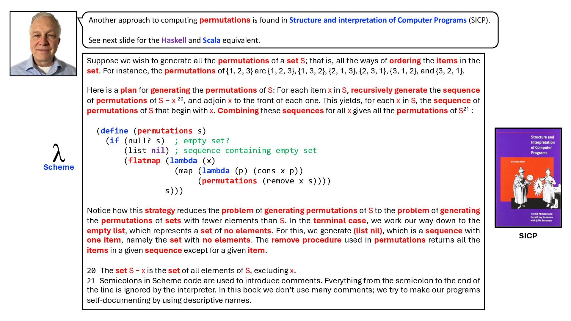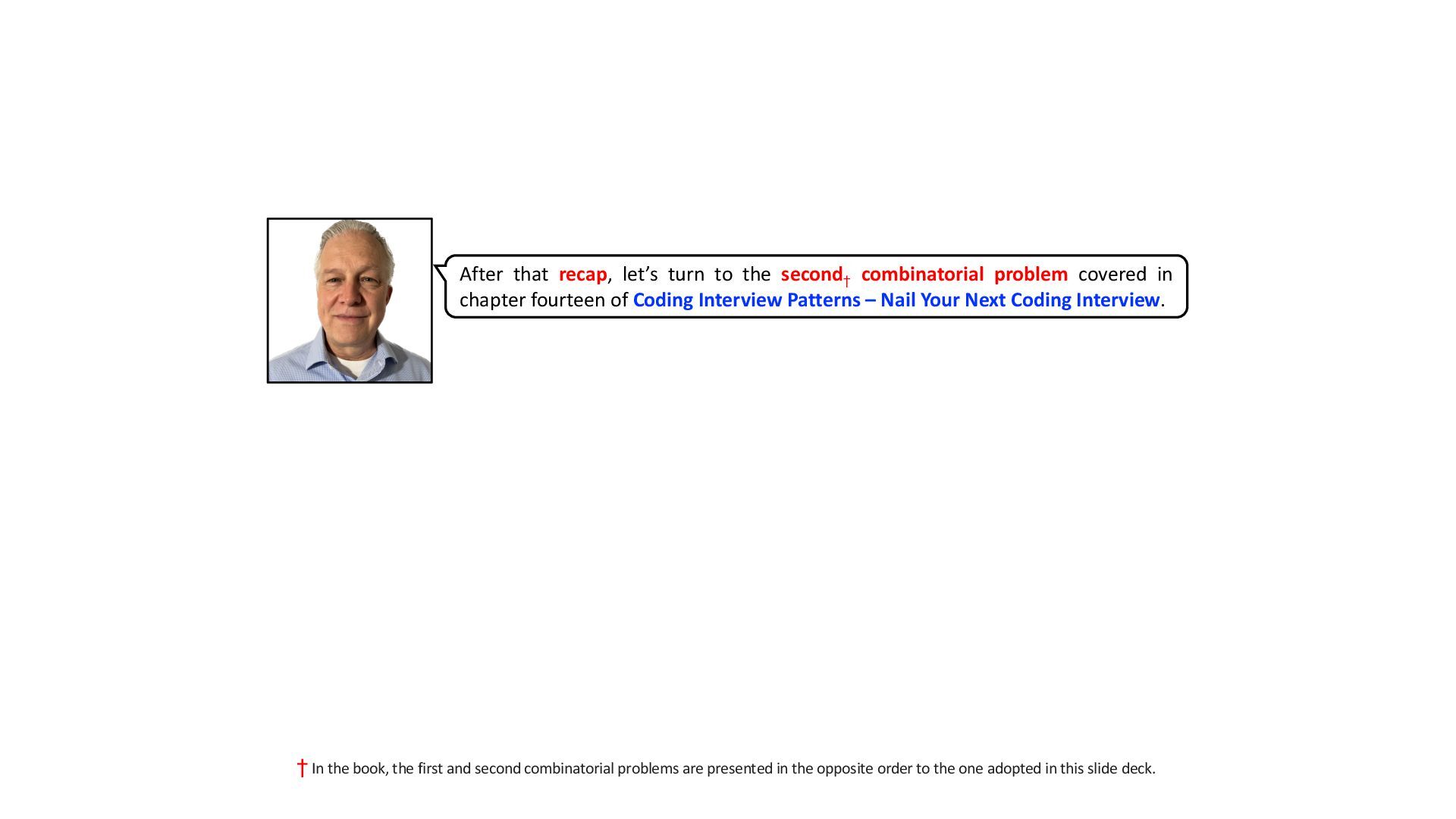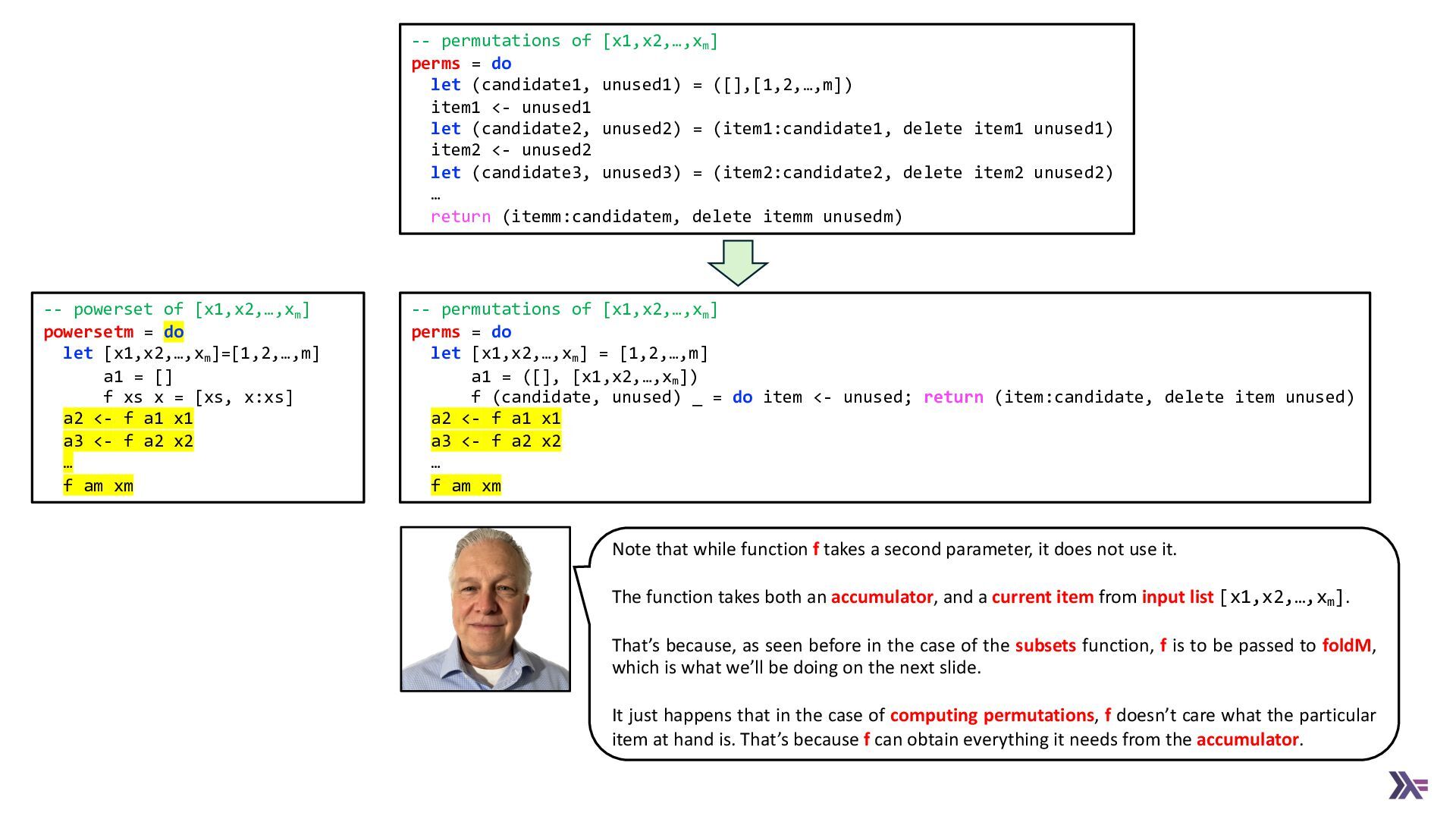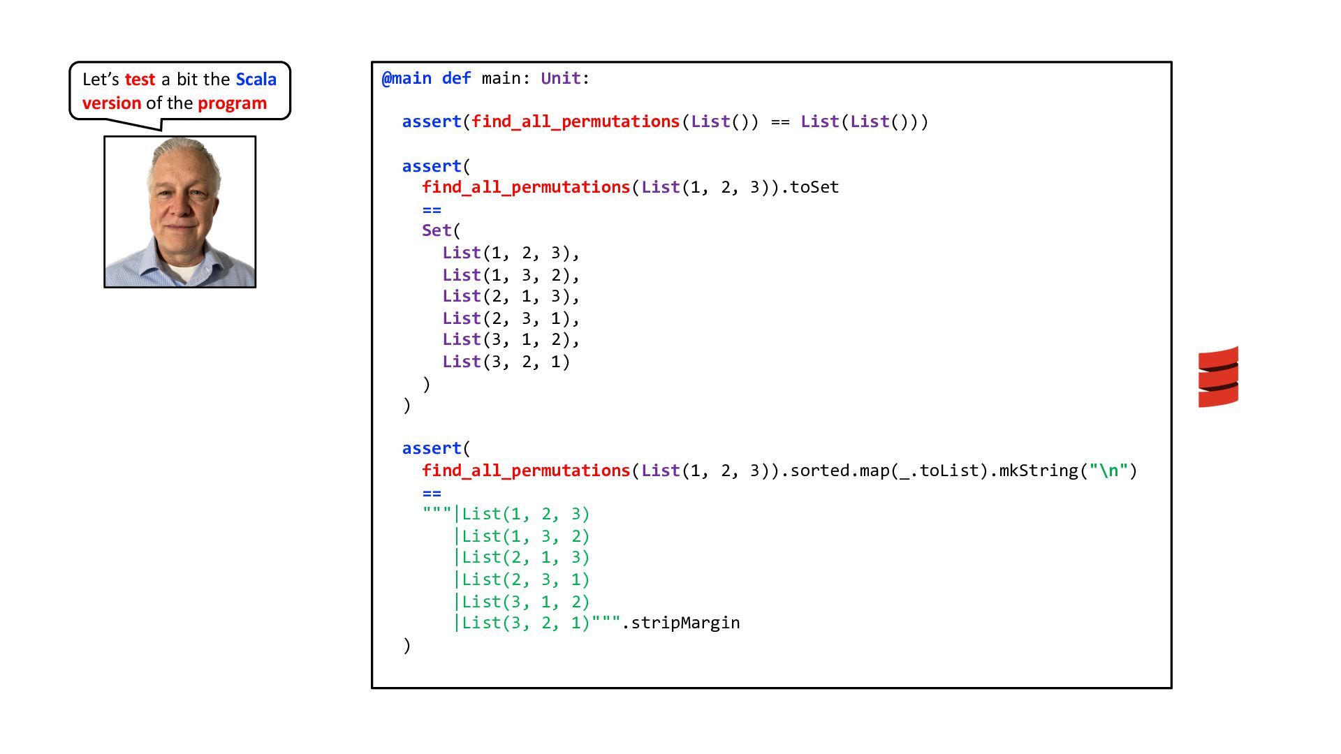 elements, method backtrack faces 1 + (∑ !"# $%# ∏ &"!'# $ 𝑗) decision points, at each of which it repeatedly chooses a number that has not yet been used in the permutation currently being generated. Choosing a number is followed by a recursive call. The total number of calls is 1 + (∑!"# $ ∏&"! $ 𝑗). def find_all_permutations(nums: List[Int]) -> List[List[Int]]: res = [] backtrack(nums, [], set(), res) return res def backtrack( nums: List[Int], candidate: List[Int], used: Set[Int], res: List[List[Int]] ) -> None: # If the current candidate is a complete # permutation, add it to the result. if len(candidate) == len(nums): res.append(candidate[:]) return for num in nums: if num not in used: # Add 'num' to the current permutation and mark it as used. candidate.append(num) used.add(num) # Recursively explore all branches using # the updated permutation candidate. backtrack(nums, candidate, used, res) # Backtrack by reversing the changes made. candidate.pop() used.remove(num) @alexxubyte Alex Xu @shaungunaw Shaun Gunawardane numbers to generate permutations with permutation grown so far numbers used up so far permutations generated so far This program is side-effecting, in that it adds/removes numbers to/from two mutable lists and a mutable set. The diagram below illustrates the computation of the permutations of a three-element list. E.g for a list with three elements: • permutations = 3! = 3 x 2 x 1 = 6 • decision pts = 1 + ∑!"# (%# ∏&"!'# ( 𝑗 = 10 • calls = 1 + ∑!"# ( ∏&"! ( 𝑗 = 16 [] [4] [6] [4,5] [4,6] [4,5,6][4,6,5] choose 4 choose 6 choose 5 choose 6 choose 6 choose 5 [5] [5,4] [5,6] [5,4,6][5,6,4] choose 4 choose 6 choose 6 choose 4 [6,4] [6,5] [6,4,5][6,5,4] choose 4 choose 5 choose 5 choose 4 choose 5 nums candidate used [4,5,6] [] {} [4,5,6] [4] {4} [4,5,6] [4,5] {4,5} [4,5,6] [4,5,6] {4,5,6} [4,5,6] [4,6] {4,6} [4,5,6] [4,6,5] {4,6,5} [4,5,6] [5] {5} … … … for num in [4,5,6]: if num not in {} for num in [4,5,6]: if num not in {4} for num in [4,5,6]: if num not in {4,5}