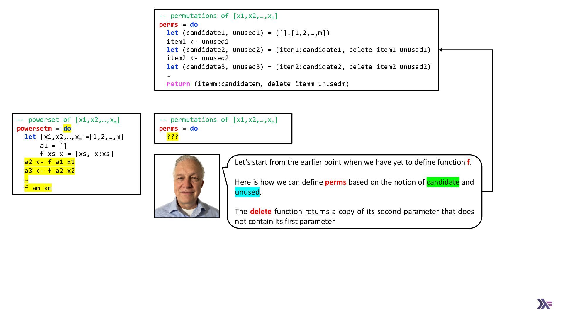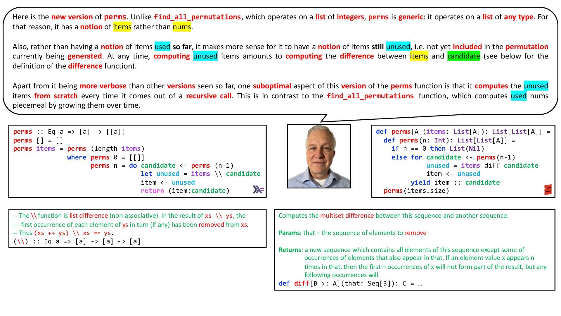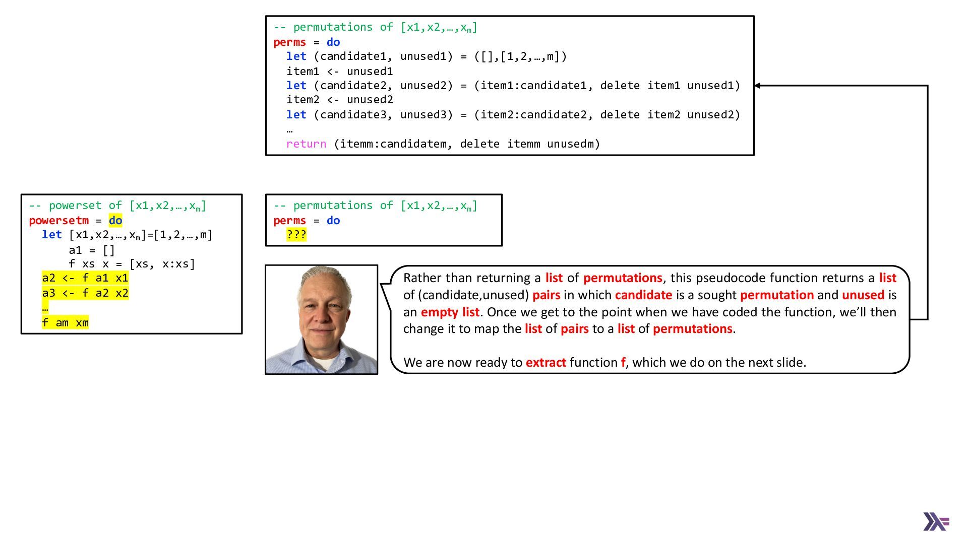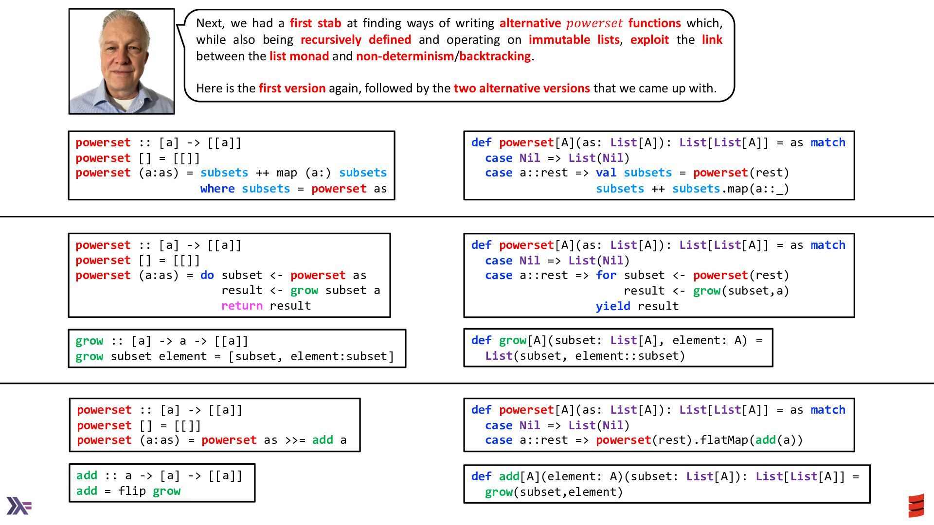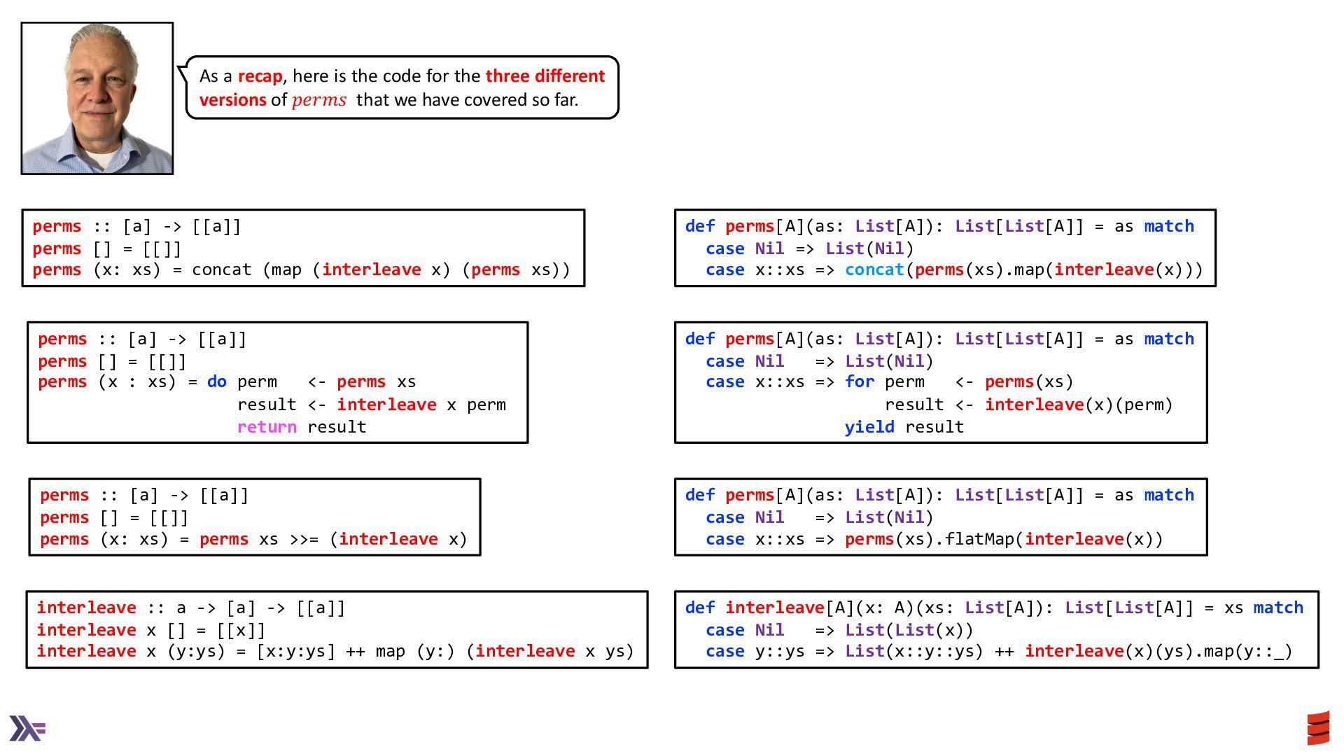 elements, method backtrack faces 1 + (∑ !"# $%# ∏ &"!'# $ 𝑗) decision points, at each of which it repeatedly chooses a number that has not yet been used in the permutation currently being generated. Choosing a number is followed by a recursive call. The total number of calls is 1 + (∑!"# $ ∏&"! $ 𝑗). def find_all_permutations(nums: List[Int]) -> List[List[Int]]: res = [] backtrack(nums, [], set(), res) return res def backtrack( nums: List[Int], candidate: List[Int], used: Set[Int], res: List[List[Int]] ) -> None: # If the current candidate is a complete # permutation, add it to the result. if len(candidate) == len(nums): res.append(candidate[:]) return for num in nums: if num not in used: # Add 'num' to the current permutation and mark it as used. candidate.append(num) used.add(num) # Recursively explore all branches using # the updated permutation candidate. backtrack(nums, candidate, used, res) # Backtrack by reversing the changes made. candidate.pop() used.remove(num) @alexxubyte Alex Xu @shaungunaw Shaun Gunawardane numbers to generate permutations with permutation grown so far numbers used up so far permutations generated so far This program is side-effecting, in that it adds/removes numbers to/from two mutable lists and a mutable set. The diagram below illustrates the computation of the permutations of a three-element list. E.g for a list with three elements: • permutations = 3! = 3 x 2 x 1 = 6 • decision pts = 1 + ∑!"# (%# ∏&"!'# ( 𝑗 = 10 • calls = 1 + ∑!"# ( ∏&"! ( 𝑗 = 16 [] [4] [6] [4,5] [4,6] [4,5,6][4,6,5] choose 4 choose 6 choose 5 choose 6 choose 6 choose 5 [5] [5,4] [5,6] [5,4,6][5,6,4] choose 4 choose 6 choose 6 choose 4 [6,4] [6,5] [6,4,5][6,5,4] choose 4 choose 5 choose 5 choose 4 choose 5 nums candidate used [4,5,6] [] {} [4,5,6] [4] {4} [4,5,6] [4,5] {4,5} [4,5,6] [4,5,6] {4,5,6} [4,5,6] [4,6] {4,6} [4,5,6] [4,6,5] {4,6,5} [4,5,6] [5] {5} … … … for num in [4,5,6]: if num not in {} for num in [4,5,6]: if num not in {4} for num in [4,5,6]: if num not in {4,5}