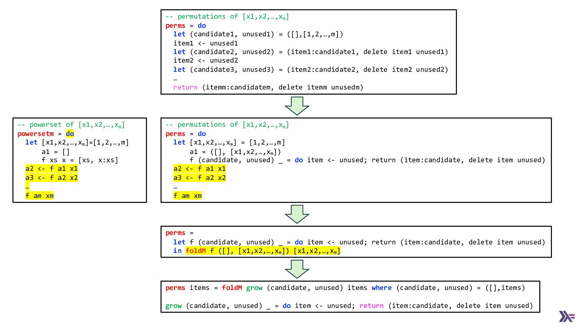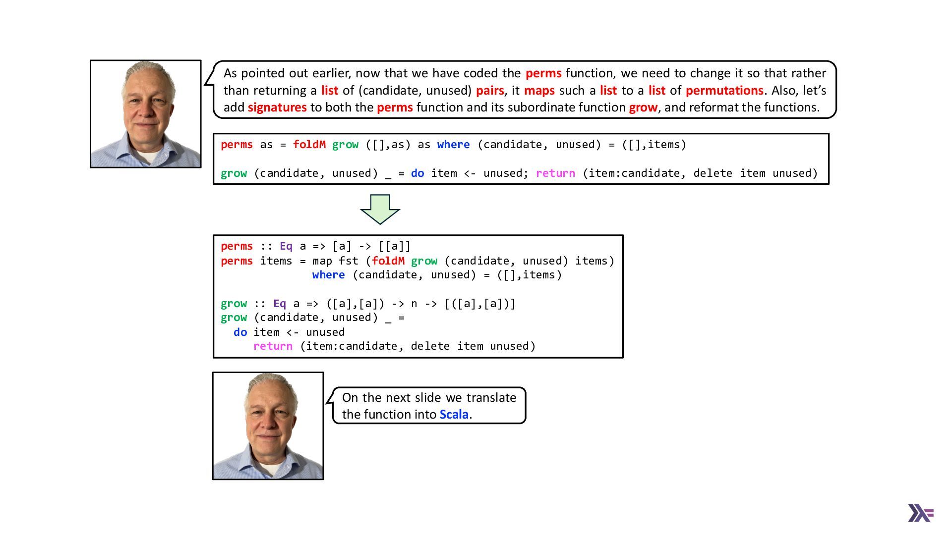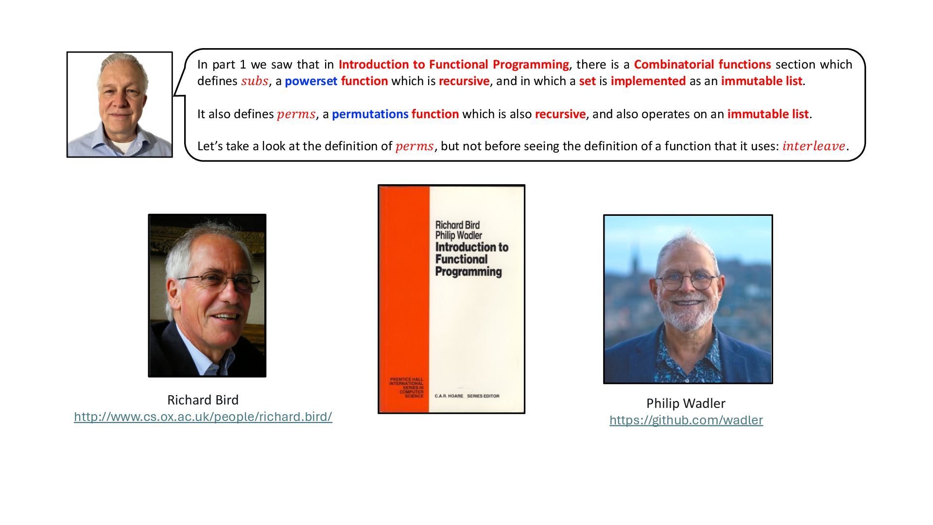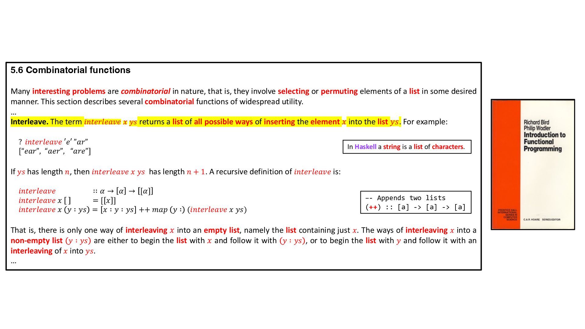 elements, method backtrack faces 1 + (∑ !"# $%# ∏ &"!'# $ 𝑗) decision points, at each of which it repeatedly chooses a number that has not yet been used in the permutation currently being generated. Choosing a number is followed by a recursive call. The total number of calls is 1 + (∑!"# $ ∏&"! $ 𝑗). def find_all_permutations(nums: List[Int]) -> List[List[Int]]: res = [] backtrack(nums, [], set(), res) return res def backtrack( nums: List[Int], candidate: List[Int], used: Set[Int], res: List[List[Int]] ) -> None: # If the current candidate is a complete # permutation, add it to the result. if len(candidate) == len(nums): res.append(candidate[:]) return for num in nums: if num not in used: # Add 'num' to the current permutation and mark it as used. candidate.append(num) used.add(num) # Recursively explore all branches using # the updated permutation candidate. backtrack(nums, candidate, used, res) # Backtrack by reversing the changes made. candidate.pop() used.remove(num) @alexxubyte Alex Xu @shaungunaw Shaun Gunawardane numbers to generate permutations with permutation grown so far numbers used up so far permutations generated so far This program is side-effecting, in that it adds/removes numbers to/from two mutable lists and a mutable set. The diagram below illustrates the computation of the permutations of a three-element list. E.g for a list with three elements: • permutations = 3! = 3 x 2 x 1 = 6 • decision pts = 1 + ∑!"# (%# ∏&"!'# ( 𝑗 = 10 • calls = 1 + ∑!"# ( ∏&"! ( 𝑗 = 16 [] [4] [6] [4,5] [4,6] [4,5,6][4,6,5] choose 4 choose 6 choose 5 choose 6 choose 6 choose 5 [5] [5,4] [5,6] [5,4,6][5,6,4] choose 4 choose 6 choose 6 choose 4 [6,4] [6,5] [6,4,5][6,5,4] choose 4 choose 5 choose 5 choose 4 choose 5 nums candidate used [4,5,6] [] {} [4,5,6] [4] {4} [4,5,6] [4,5] {4,5} [4,5,6] [4,5,6] {4,5,6} [4,5,6] [4,6] {4,6} [4,5,6] [4,6,5] {4,6,5} [4,5,6] [5] {5} … … … for num in [4,5,6]: if num not in {} for num in [4,5,6]: if num not in {4} for num in [4,5,6]: if num not in {4,5}