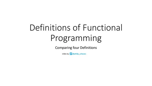 input parameters and (b) its algorithm to produce its result. A pure function has no “back doors,” which means: 1. Its result can’t depend on reading any hidden value outside of the function scope, such as another field in the same class or global variables. 2. It cannot modify any hidden fields outside of the function scope, such as other mutable fields in the same class or global variables. 3. It cannot depend on any external I/O. It can’t rely on input from files, databases, web services, UIs, etc; it can’t produce output, such as writing to a file, database, or web service, writing to a screen, etc. 2. A pure function does not modify its input parameters. A pure function is a function that depends only on its declared input parameters and its algorithm to produce its output. It does not read any other values from “the outside world” — the world outside of the function’s scope — and it does not modify any values in the outside world Functional programming is a way of writing software applications using only pure functions and immutable values. FP means programming with pure functions, and a pure function is one that lacks side effects… A function f with input type A and output type B (written in Scala as a single type: A => B , pronounced “A to B ” or “A arrow B ”) is a computation that relates every value a of type A to exactly one value b of type B such that b is determined solely by the value of a. Any changing state of an internal or external process is irrelevant to computing the result f(a). For example, a function intToString having type Int => String will take every integer to a corresponding string. Furthermore, if it really is a function, it will do nothing else. In other words, a function has no observable effect on the execution of the program other than to compute a result given its inputs; we say that it has no side effects. We sometimes qualify such functions as pure functions to make this more explicit, but this is somewhat redundant. FP in Scala by Paul Chiusano and Runar Bjarnason @pchiusano @runarorama by Sam Halliday @fommil by Alvin Alexander @alvinalexander Definitions of Functional Programming 1.2 Pure Functional Programming Functional Programming is the act of writing programs with pure functions. Pure functions have three properties: • Total: return a value for every possible input • Deterministic: return the same value for the same input • Inculpable: no (direct) interaction with the world or program state. Together, these properties give us an unprecedented ability to reason about our code. For example, input validation is easier to isolate with totality, caching is possible when functions are deterministic, and interacting with the world is easier to control, and test, when functions are inculpable. The kinds of things that break these properties are side effects: directly accessing or changing mutable state (e.g. maintaining a var in a class or using a legacy API that is impure), communicating with external resources (e.g. files or network lookup), or throwing exceptions. FP is just programming with functions. Functions are: 1. Total: They return an output for every input. 2. Deterministic: They return the same output for the same input. 3. Pure: Their only effect is computing the output. The rest is just composition you can learn over time. NO SIDE EFFECTS john Ⓐ De Goes PF = ODI + NSE Pure Functions = Output Depends only on Input + No Side Effects) A pure function has no side effects, meaning that it does not read anything from the outside world or write anything to the outside world. As a result of 1, if a pure function is called with an input parameter x an infinite number of times, it will always return the same result y. This is unlike an OOP method, which can depend on other fields in the same class as the method.