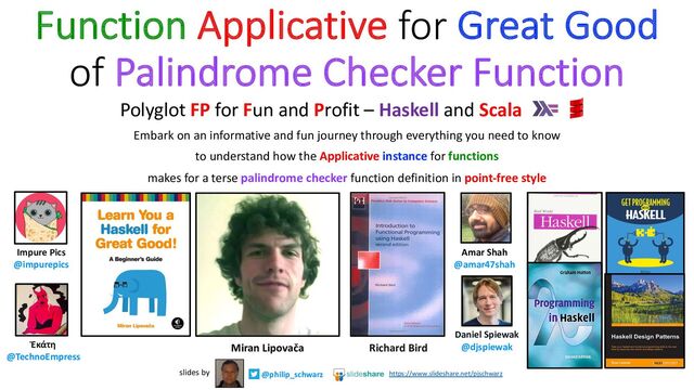 is how it looks in Haskell, followed by some examples of its usage. instance Applicative [] where pure x = [x] fs <*> xs = [f x | f <- fs, x <- xs] class Functor f => Applicative f where pure :: a -> f a (<*>) :: f (a -> b) -> f a -> f b λ (+) <$> [1,2,3] <*> [10,20,30] [11,21,31,12,22,32,13,23,33] λ (+) <$> [1,2,3] <*> [10] [11,12,13] λ (+) <$> [1,2,3] <*> [] [] λ max3 x y z = max x (max y z) λ max3 <$> [6,2] <*> [3,5] <*> [4,9] [6,9,6,9,4,9,5,9] λ max3 <$> [6,2] <*> [3] <*> [4,9] [6,9,4,9] λ max3 <$> [6,2] <*> [] <*> [4,9] [] λ max3 <$> [] <*> [3,5] <*> [4,9] [] λ inc n = n + 1 λ twice n = n + n λ square n = n * n λ [inc, twice, square] <*> [1,2,3] [2,3,4,2,4,6,1,4,9] λ [inc, twice, square] <*> [3] [4,6,9] λ [inc, twice, square] <*> [] [] λ [inc] <*> [1,2,3] [2,3,4] λ [] <*> [1,2,3] [] λ :type (,) (,) :: a -> b -> (a, b) λ (,) <$> ['a','b'] <*> [1,2] [('a',1),('a',2),('b',1),('b',2)] λ [(+),(*)] <*> [10,20,30] <*> [1,2] [11,12,21,22,31,32,10,20,20,40,30,60] λ [(+),(*)] <*> [10,20,30] <*> [2] [12,22,32,20,40,60] λ [(+),(*)] <*> [10] <*> [1,2] [11,12,10,20] λ [(+),(*)] <*> [] <*> [1,2] [] λ [(+),(*)] <*> [10,20,30] <*> [] [] λ [(+)] <*> [10,20,30] <*> [1,2] [11,12,21,22,31,32] λ [] <*> [10,20,30] <*> [1,2] []