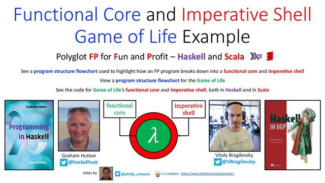= survivors b ++ births b survivors :: Board -> [Pos] survivors b = [p | p <- b, elem (liveneighbs b p) [2,3]] births :: Board -> [Pos] births b = [p | p <- rmdups (concat (map neighbs b)), isEmpty b p, liveneighbs b p == 3] neighbs :: Pos -> [Pos] neighbs (x,y) = map wrap [(x-1, y-1), (x, y-1), (x+1, y-1), (x-1, y ), (x+1, y), (x-1, y+1), (x, y+1), (x+1, y+1)] wrap :: Pos -> Pos wrap (x,y) = (((x-1) `mod` width) + 1, ((y-1) `mod` height) + 1) width :: Int height :: Int width = 20 height = 20 rmdups :: Eq a => [a] -> [a] rmdups [] = [] rmdups (x:xs) = x : rmdups (filter (/= x) xs) isEmpty :: Board -> Pos -> Bool isEmpty b p = not (isAlive b p) liveneighbs :: Board -> Pos -> Int liveneighbs b = length.filter(isAlive b).neighbs isAlive :: Board -> Pos -> Bool isAlive b p = elem p b pulsar :: Board pulsar = [(4, 2),(5, 2),(6, 2),(10, 2),(11, 2),(12, 2), (2, 4),(7, 4),( 9, 4),(14, 4), (2, 5),(7, 5),( 9, 5),(14, 5), (2, 6),(7, 6),( 9, 6),(14, 6), (4, 7),(5, 7),(6, 7),(10, 7),(11, 7),(12, 7), (4, 9),(5, 9),(6, 9),(10, 9),(11, 9),(12, 9), (2,10),(7,10),( 9,10),(14,10), (2,11),(7,11),( 9,11),(14,11), (2,12),(7,12),( 9,12),(14,12), (4,14),(5,14),(6,14),(10,14),(11,14),(12,14)] type Pos = (Int,Int) type Board = [Pos] FUNCTIONAL CORE