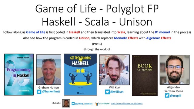 width = 20 val height = 20 def neighbs(p: Pos): List[Pos] = p match { case (x,y) => List( (x - 1, y - 1), (x, y - 1), (x + 1, y - 1), (x - 1, y ), (x + 1, y ), (x - 1, y + 1), (x, y + 1), (x + 1, y + 1) ) map wrap } def wrap(p:Pos): Pos = p match { case (x, y) => (((x - 1) % width) + 1, ((y - 1) % height) + 1) } def survivors(b: Board): List[Pos] = for { p <- b if List(2,3) contains liveneighbs(b)(p) } yield p def births(b: Board): List[Pos] = for { p <- rmdups(b flatMap neighbs) if isEmpty(b)(p) if liveneighbs(b)(p) == 3 } yield p def rmdups[A](l: List[A]): List[A] = l match { case Nil => Nil case x::xs => x::rmdups(xs filter(_ != x)) } def nextgen(b: Board): Board = survivors(b) ++ births(b) def isAlive(b: Board)(p: Pos): Boolean = b contains p def isEmpty(b: Board)(p: Pos): Boolean = !(isAlive(b)(p)) def liveneighbs(b:Board)(p: Pos): Int = neighbs(p).filter(isAlive(b)).length val glider: Board = List((4,2),(2,3),(4,3),(3,4),(4,4)) val gliderNext: Board = List((3,2),(4,3),(5,3),(3,4),(4,4)) val pulsar: Board = List( (4, 2),(5, 2),(6, 2),(10, 2),(11, 2),(12, 2), (2, 4),(7, 4),( 9, 4),(14, 4), (2, 5),(7, 5),( 9, 5),(14, 5), (2, 6),(7, 6),( 9, 6),(14, 6), (4, 7),(5, 7),(6, 7),(10, 7),(11, 7),(12, 7), (4, 9),(5, 9),(6, 9),(10, 9),(11, 9),(12, 9), (2,10),(7,10),( 9,10),(14,10), (2,11),(7,11),( 9,11),(14,11), (2,12),(7,12),( 9,12),(14,12), (4,14),(5,14),(6,14),(10,14),(11,14),(12,14)]) PURE FUNCTIONS