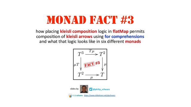 A => B): List[B] = this flatMap { a => Cons(f(a), Nil) } def flatMap[B](f: A => List[B]): List[B] = this match { case List => Nil case Cons(a, tail) => concatenate(f(a), (tail flatMap f)) } } case object Nil extends List[Nothing] case class Cons[+A](head: A, tail: List[A]) extends List[A] object List { def concatenate[A](left:List[A], right:List[A]):List[A] = left match { case Nil => right case Cons(head, tail) => Cons(head, concatenate(tail, right)) } } // sample Kleisli arrows val twoCharsFrom: Char => List[Char] = c => Cons(c, Cons((c+1).toChar, Nil)) val twoIntsFrom: Char => List[Int] = c => Cons(c, Cons(c+1, Nil)) val twoBoolsFrom: Int => List[Boolean] = n => Cons(n % 2 == 0, Cons(n % 2 == 1, Nil)) assert(twoCharsFrom(โAโ)==Cons('A',Cons('B',Nil))) assert(twoIntsFrom(โAโ)== Cons(65,Cons(66,Nil))) assert(twoBoolsFrom(66)==Cons(true,Cons(false,Nil))) // composing the arrows using a for comprehension val result: List[String] = for { char <- twoCharsFrom('A') int <- twoIntsFrom(char) bool <- twoBoolsFrom(int) } yield s"$char-$int-$boolโ assert( result == Cons("A-65-false",Cons("A-65-true", Cons("A-66-true",Cons("A-66-false", Cons("B-66-true",Cons("B-66-false", Cons("B-67-false",Cons("B-67-true",Nil )))))))) )