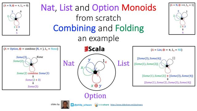 Seq() => Nil case _ => Cons(as.head, List(as.tail*)) def nil[A]: List[A] = Nil def append[A](lhs: List[A], rhs: List[A]): List[A] = lhs match case Nil => rhs case Cons(a, rest) => Cons(a,append(rest,rhs)) extension [A](lhs: List[A]) def ++(rhs: List[A]): List[A] = append(lhs,rhs) def fold[A](as: List[A])(using ma: Monoid[A]): A = foldRight(as, ma.unit, (a,b) => ma.combine(a,b)) def foldRight[A,B](as: List[A], b: B, f: (A, B) => B): B = as match case Nil => b case Cons(a,rest) => f(a,foldRight(rest,b,f)) assert(fold(List(one,two,three,four)) == one + two + three + four) assert(fold(nil[Nat]) == zero) assert(fold(List(List(one,two),Nil,List(three, four),List(five,six))) == List(one,two,three,four,five,six)) Same as the previous slide, except that here we define fold in terms of foldRight. @philip_schwarz