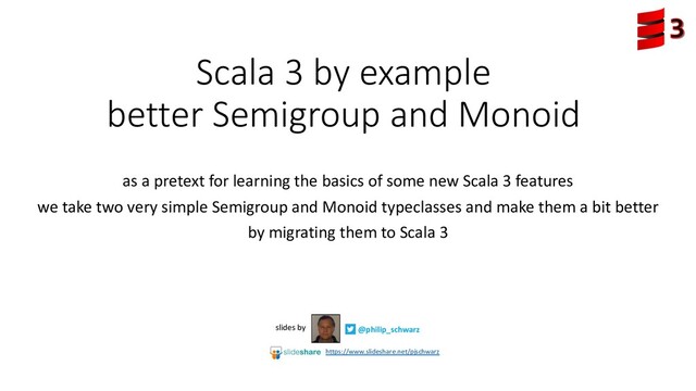 slides can look grainy and/or out of focus when seen on slideshare - download for flawless quality - As a pretext for learning the basics of some new Scala 3 features, we take two very simple Semigroup and Monoid typeclasses and make them a bit better by migrating them to Scala 3.