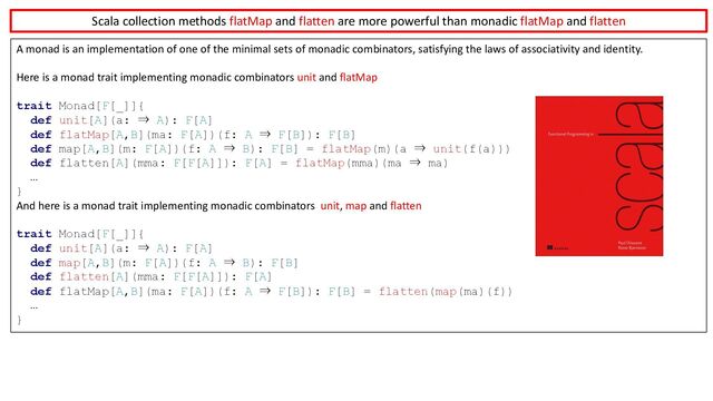 monadic flatMap and flatten A monad is an implementation of one of the minimal sets of monadic combinators, satisfying the laws of associativity and identity. Here is a monad trait implementing monadic combinators unit and flatMap trait Monad[F[_]]{ def unit[A](a: ⇒ A): F[A] def flatMap[A,B](ma: F[A])(f: A ⇒ F[B]): F[B] def map[A,B](m: F[A])(f: A ⇒ B): F[B] = flatMap(m)(a ⇒ unit(f(a))) def flatten[A](mma: F[F[A]]): F[A] = flatMap(mma)(ma ⇒ ma) … } And here is a monad trait implementing monadic combinators unit, map and flatten trait Monad[F[_]]{ def unit[A](a: ⇒ A): F[A] def map[A,B](m: F[A])(f: A ⇒ B): F[B] def flatten[A](mma: F[F[A]]): F[A] def flatMap[A,B](ma: F[A])(f: A ⇒ F[B]): F[B] = flatten(map(ma)(f)) … }