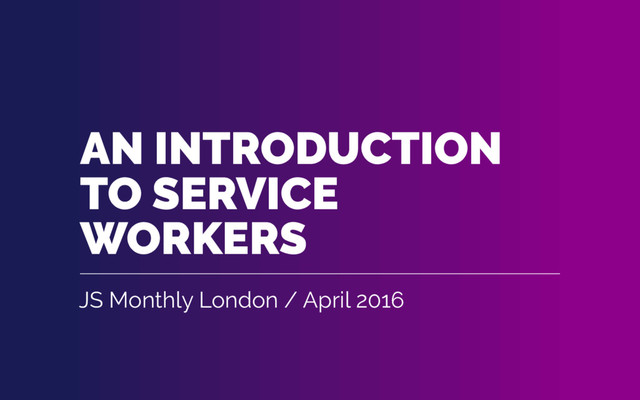 Service Workers are the biggest thing to hit the browser since XMLHttpRequest. We'll take a look at what the Service Worker can do for your app and more importantly, your users. We'll see the surprisingly small amount of code you need to get started with a Service Worker and finally we'll take a look at Progressive Web Apps and how the Service Worker will take part in a revolution for web applications.
