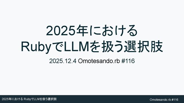 2025年における RubyでLLMを扱う選択肢 Omotesando.rb #116 2025年における RubyでLLMを扱う選択肢 2025.12.4 Omotesando.rb