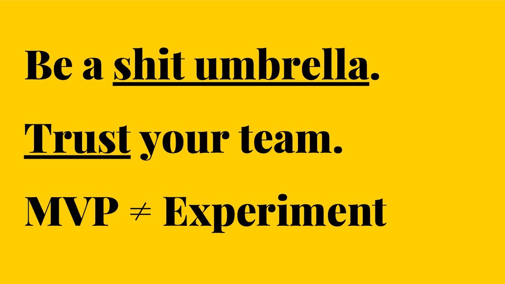 Be a shit umbrella. Trust your team. MVP ≠ Experiment