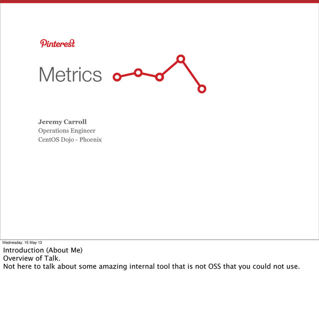 Helps determine unbalanced systems • Read vs. write requests • Errors • Percentiles • 50,75,90,95,99,999,(9999?) • Latency • Measure bandwidth (payload) size Wednesday, 15 May 13 Example of Counters being the same as a Gauge when derivative Measure long tail Make sure to measure payload as it can impact latency (ZooKeeper story) Counters for Requests per second helps a lot. Gauges do not.