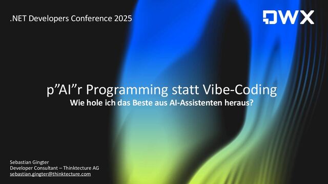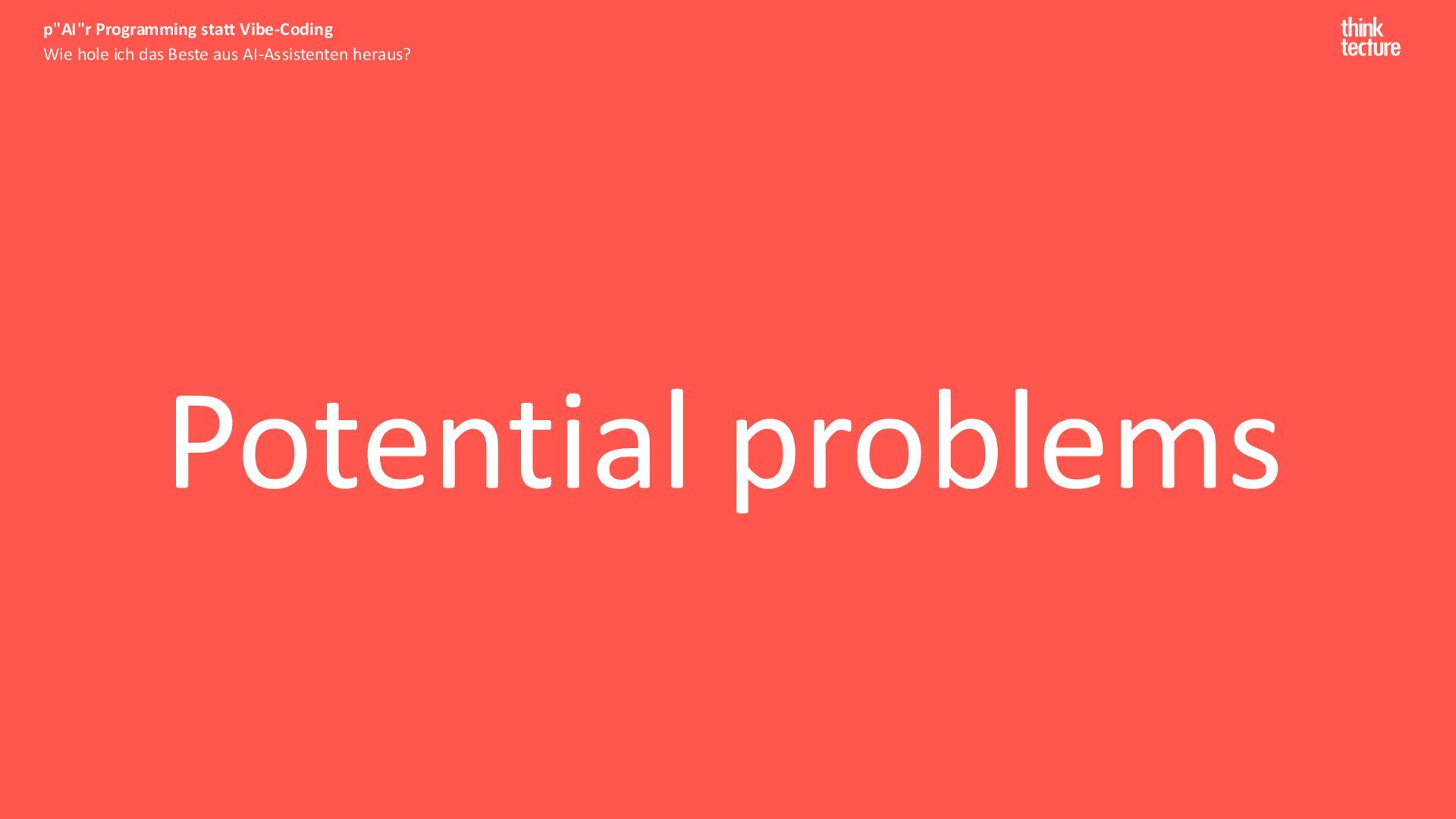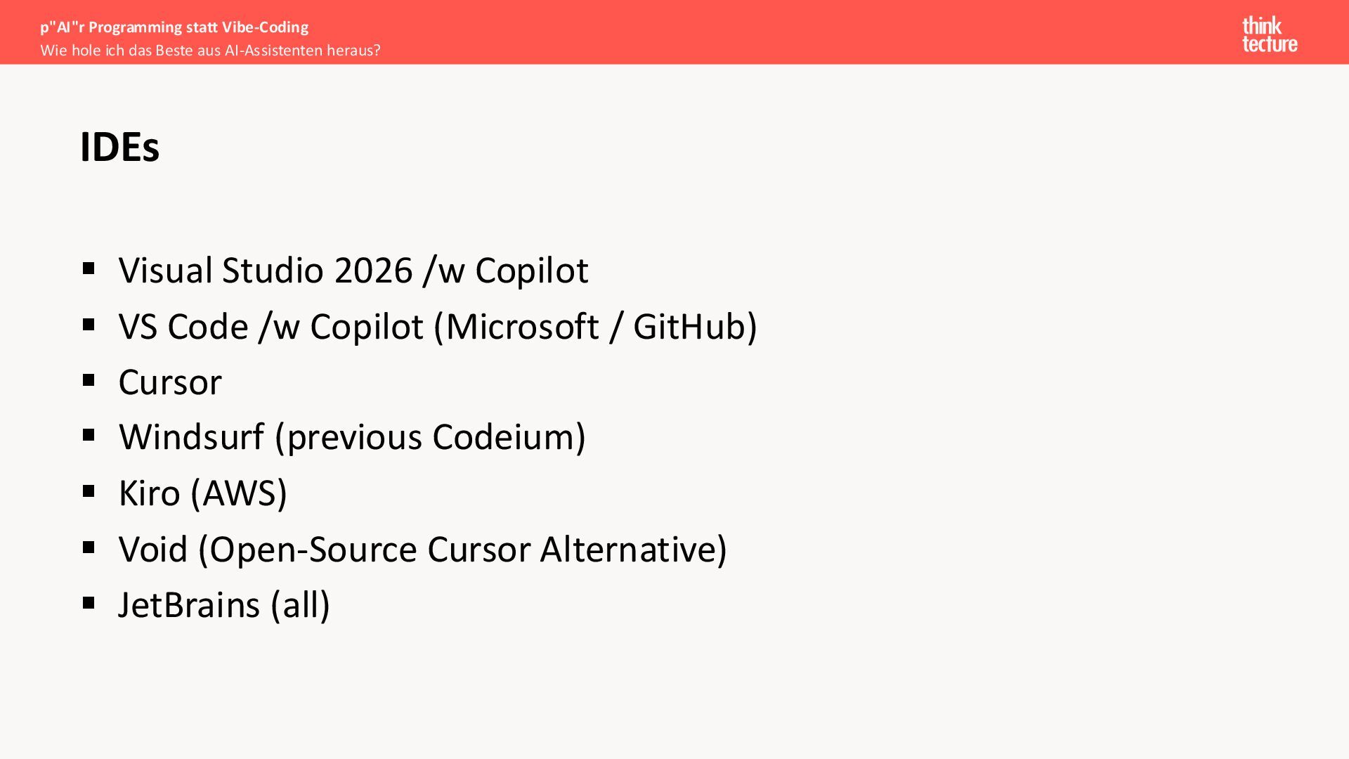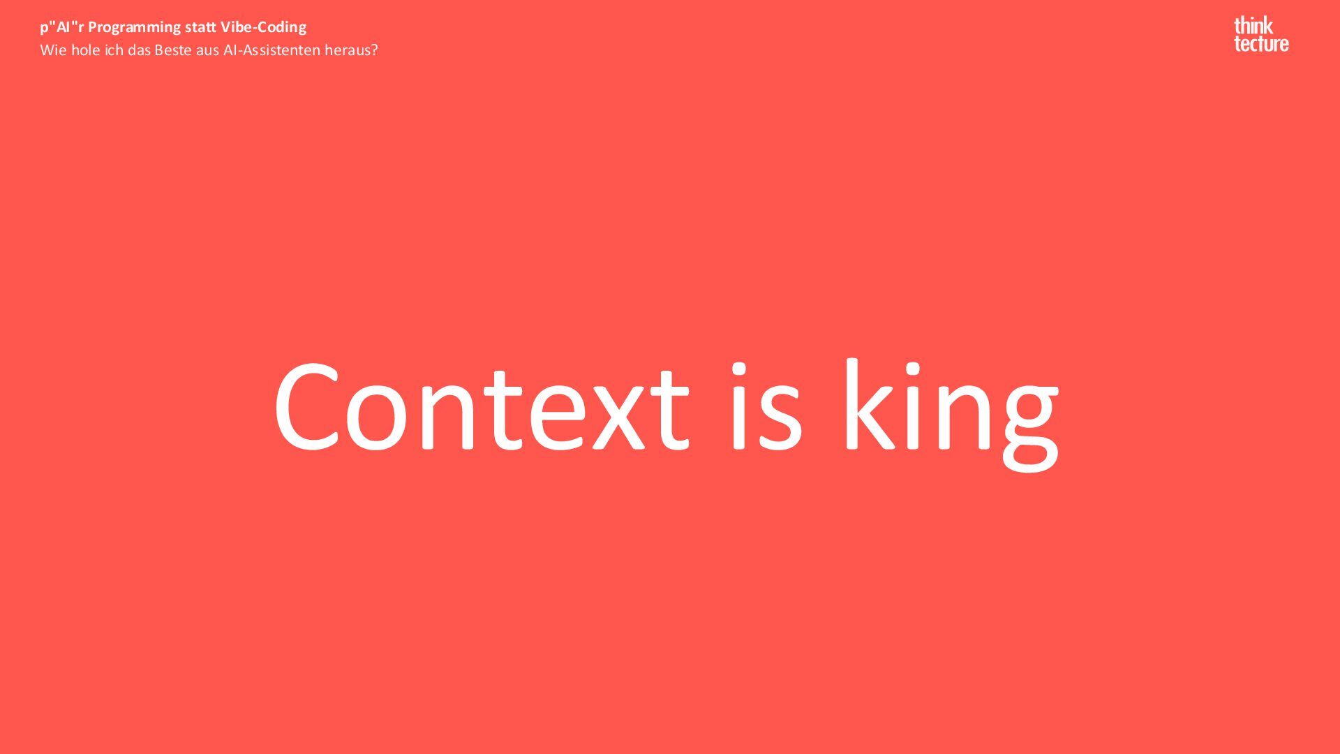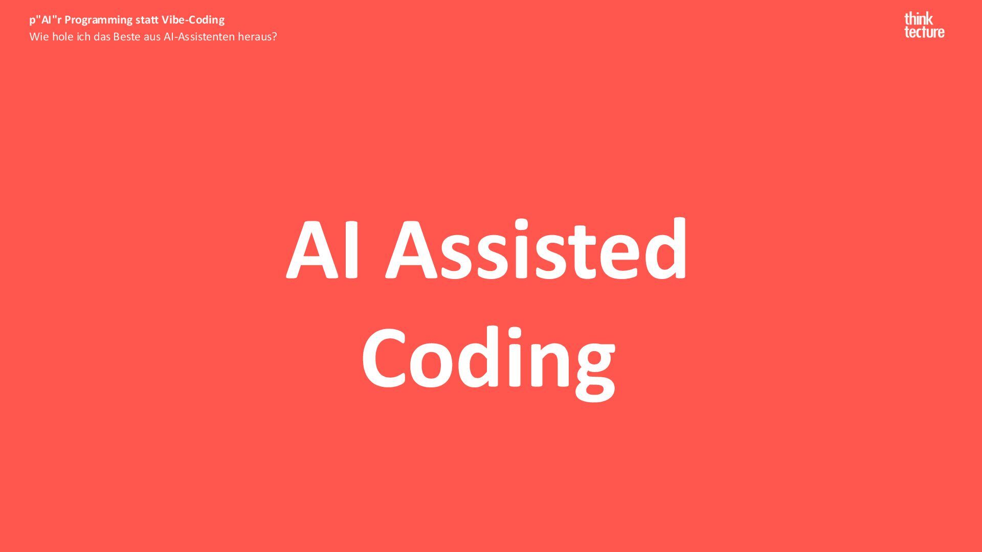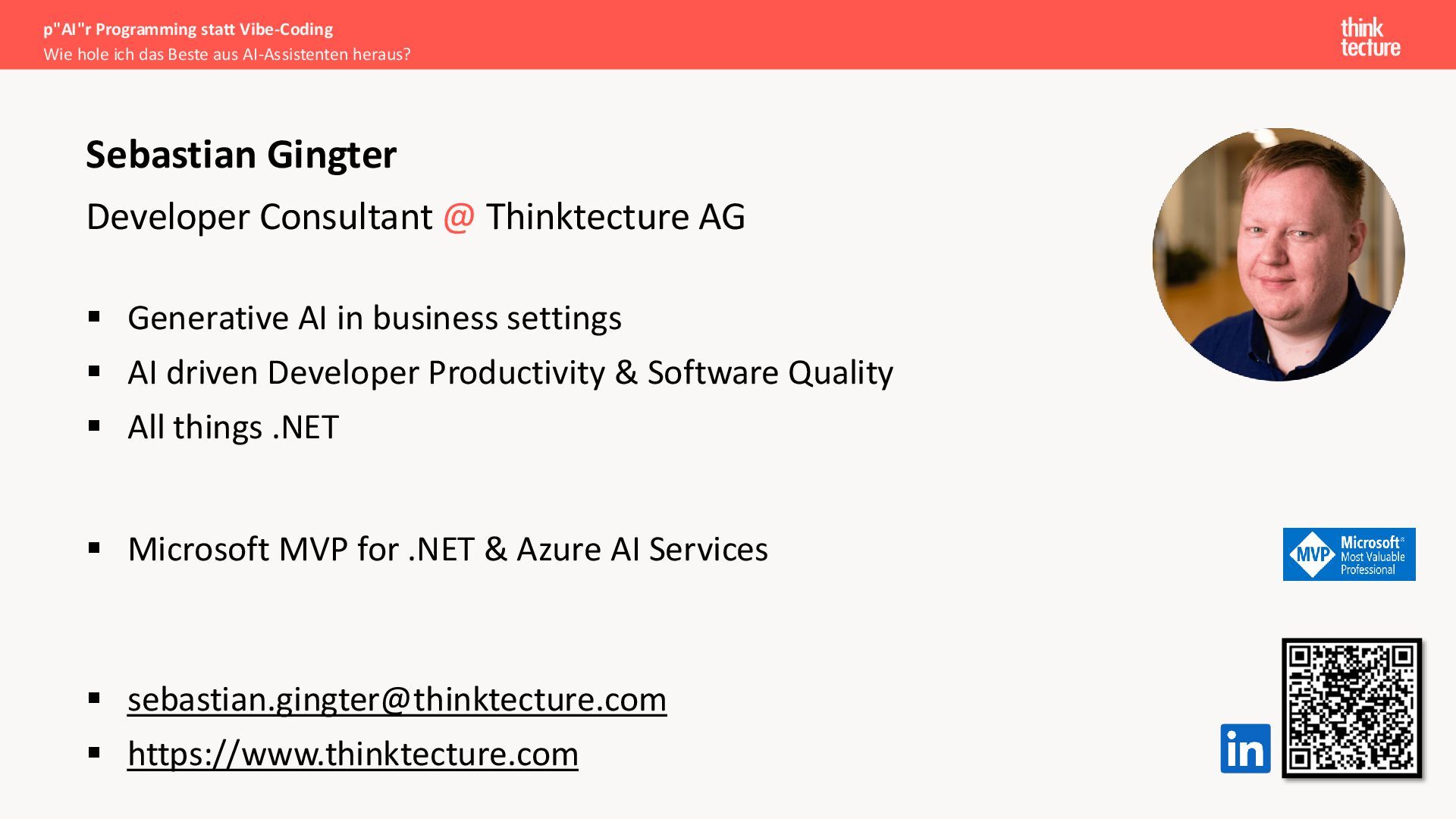 Productivity & Software Quality ▪ All things .NET ▪ Microsoft MVP for .NET & Azure AI Services ▪ [email protected] ▪ https://www.thinktecture.com Sebastian Gingter Developer Consultant @ Thinktecture AG Wie hole ich das Beste aus AI-Assistenten heraus? p"AI"r Programming statt Vibe-Coding