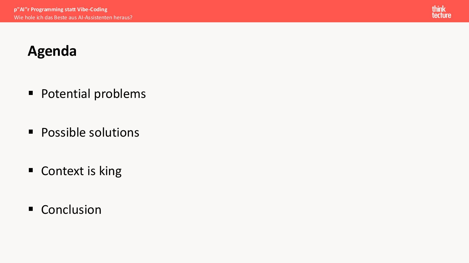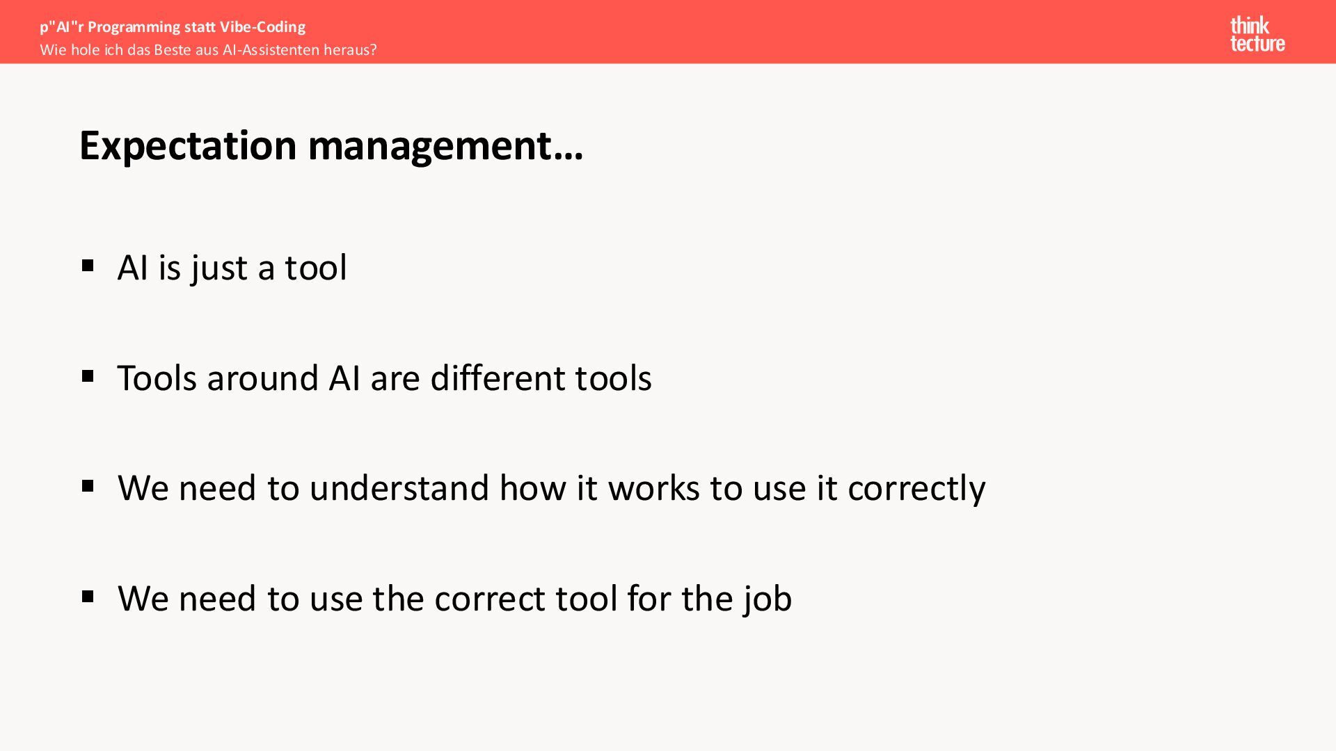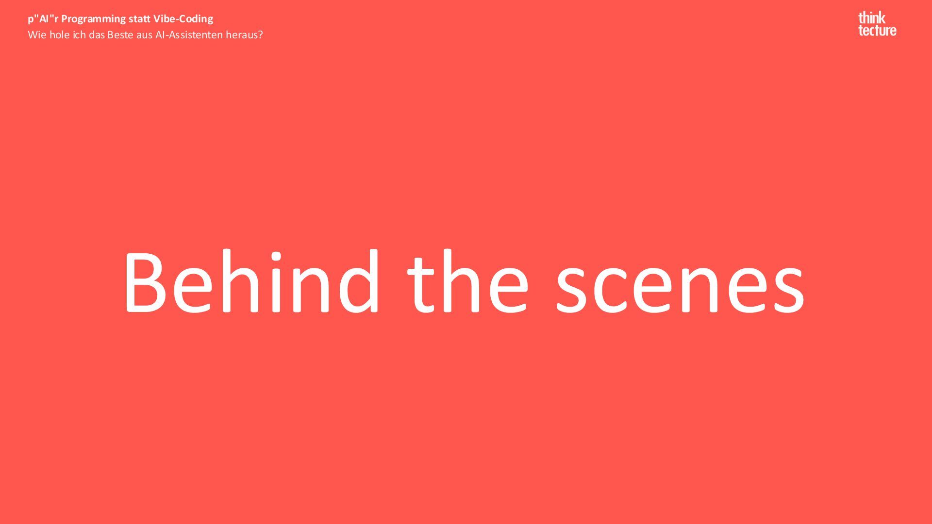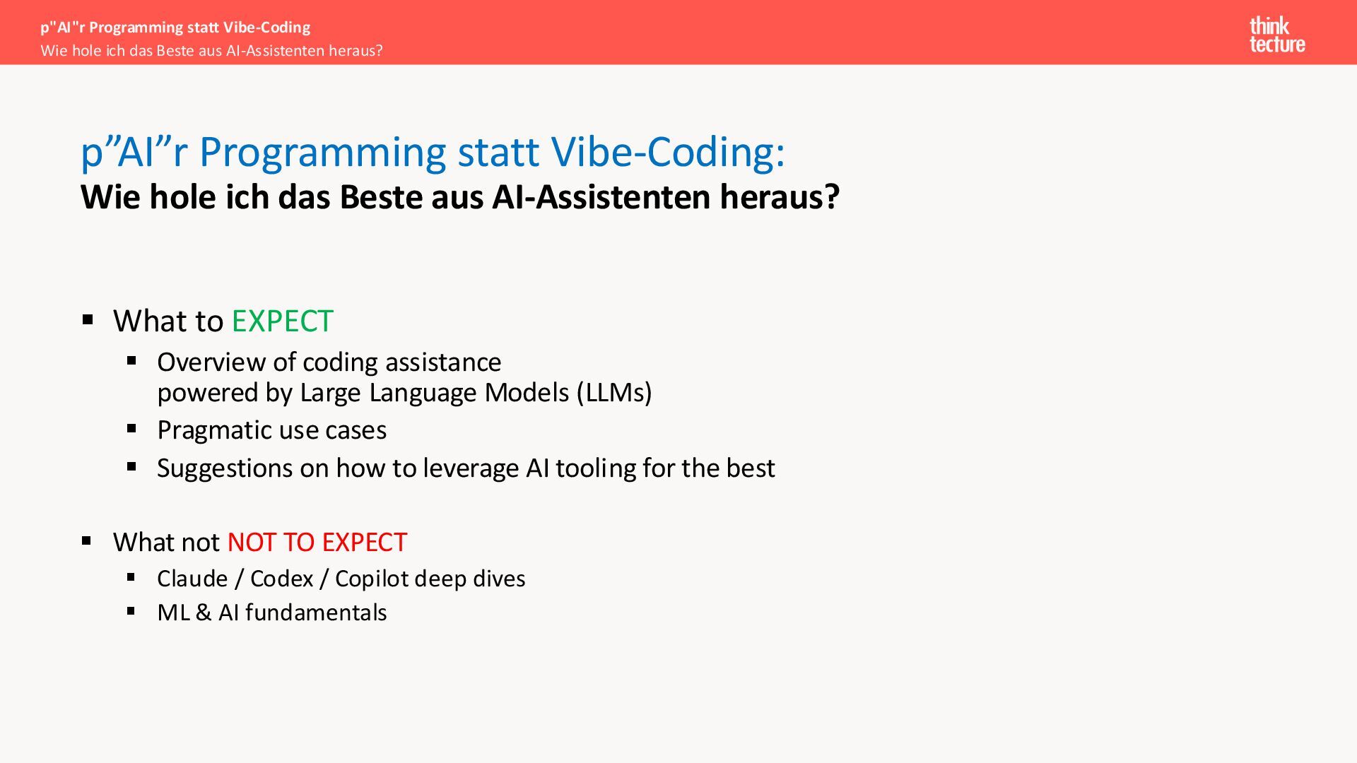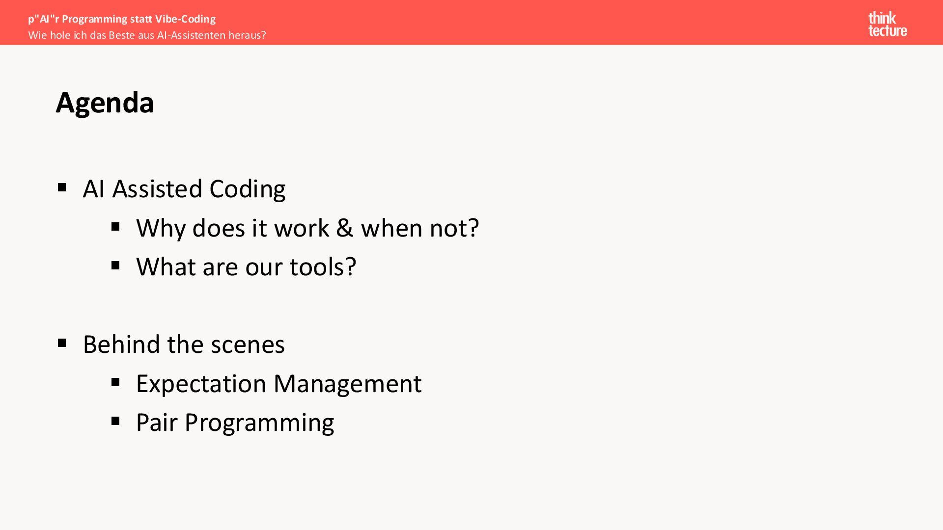 & when not? ▪ What are our tools? ▪ Behind the scenes ▪ Expectation Management ▪ Pair Programming Wie hole ich das Beste aus AI-Assistenten heraus? p"AI"r Programming statt Vibe-Coding