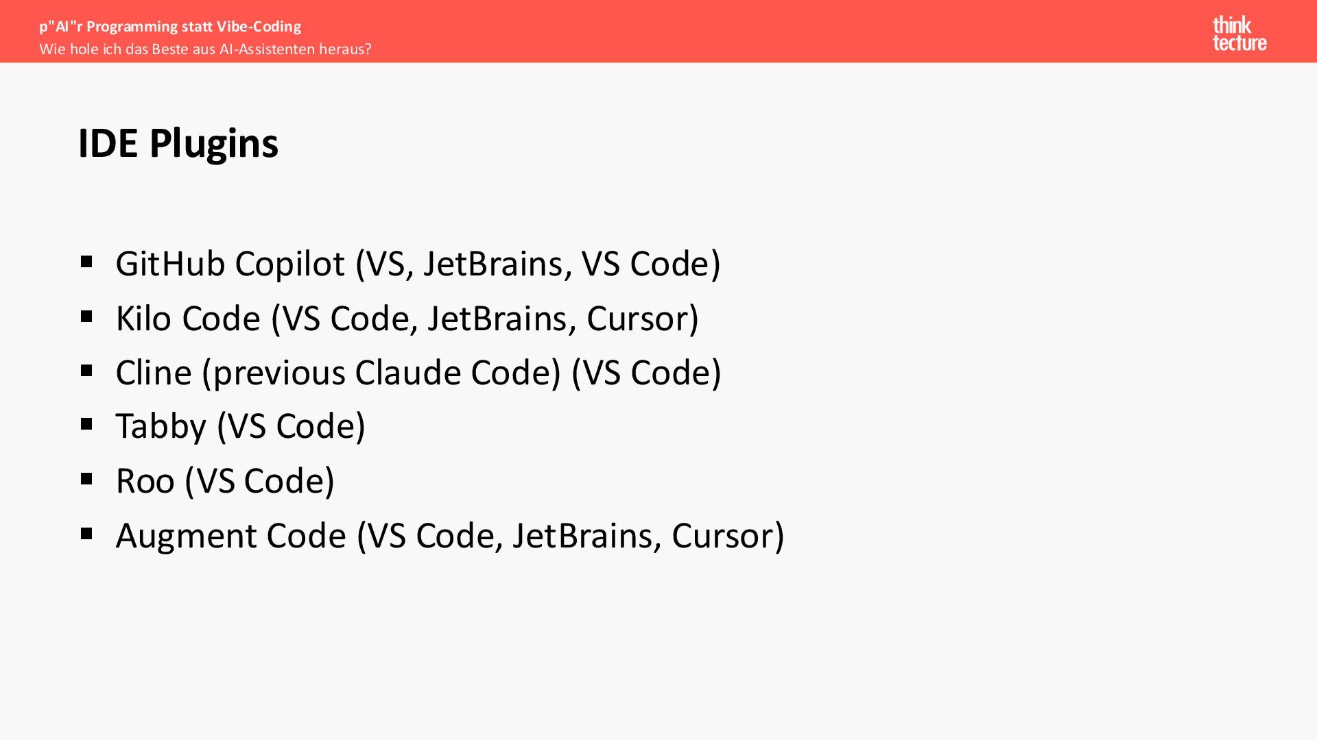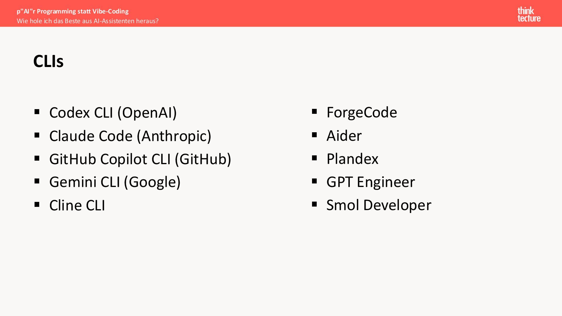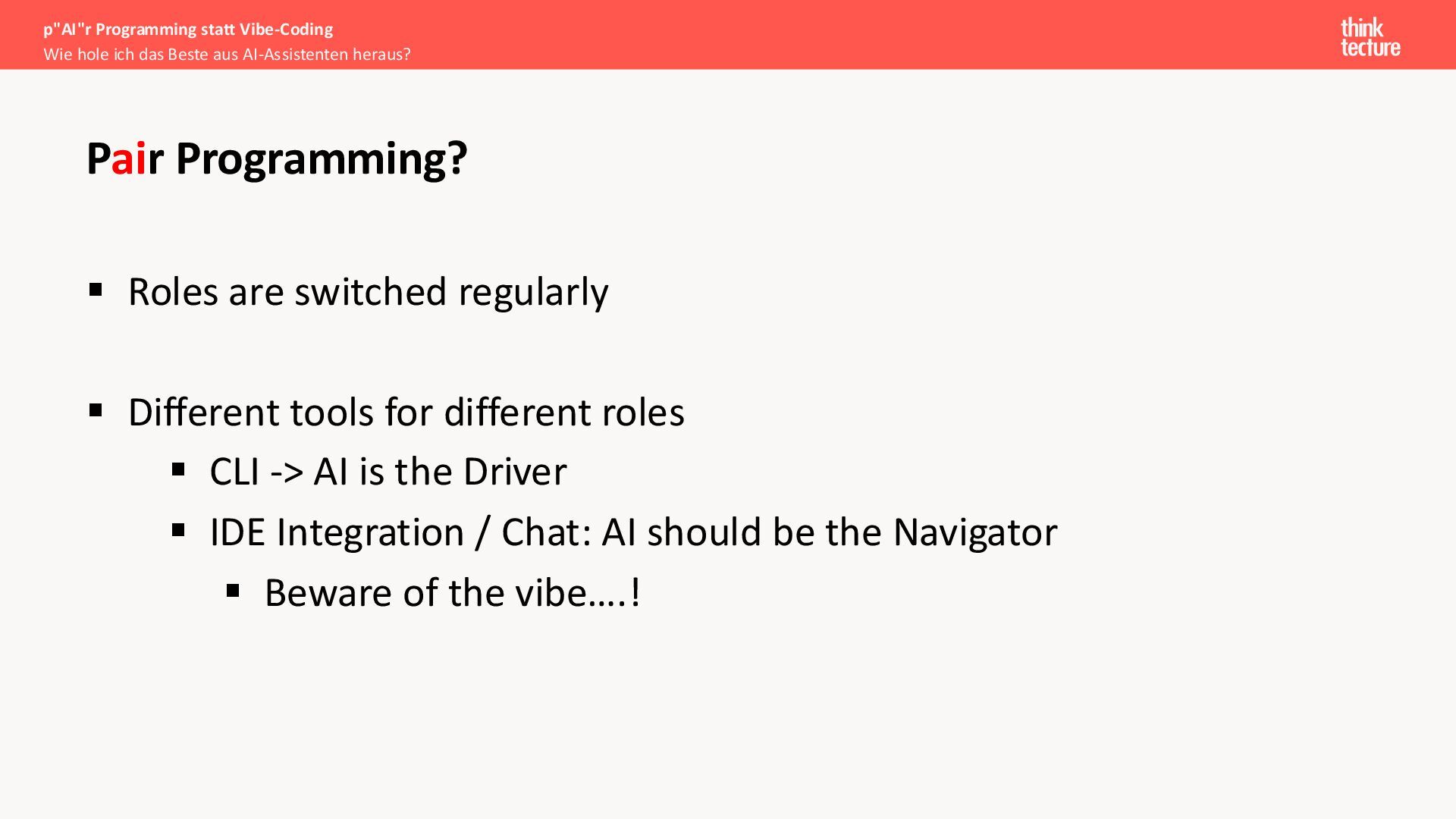for different roles ▪ CLI -> AI is the Driver ▪ IDE Integration / Chat: AI should be the Navigator ▪ Beware of the vibe….! Wie hole ich das Beste aus AI-Assistenten heraus? p"AI"r Programming statt Vibe-Coding