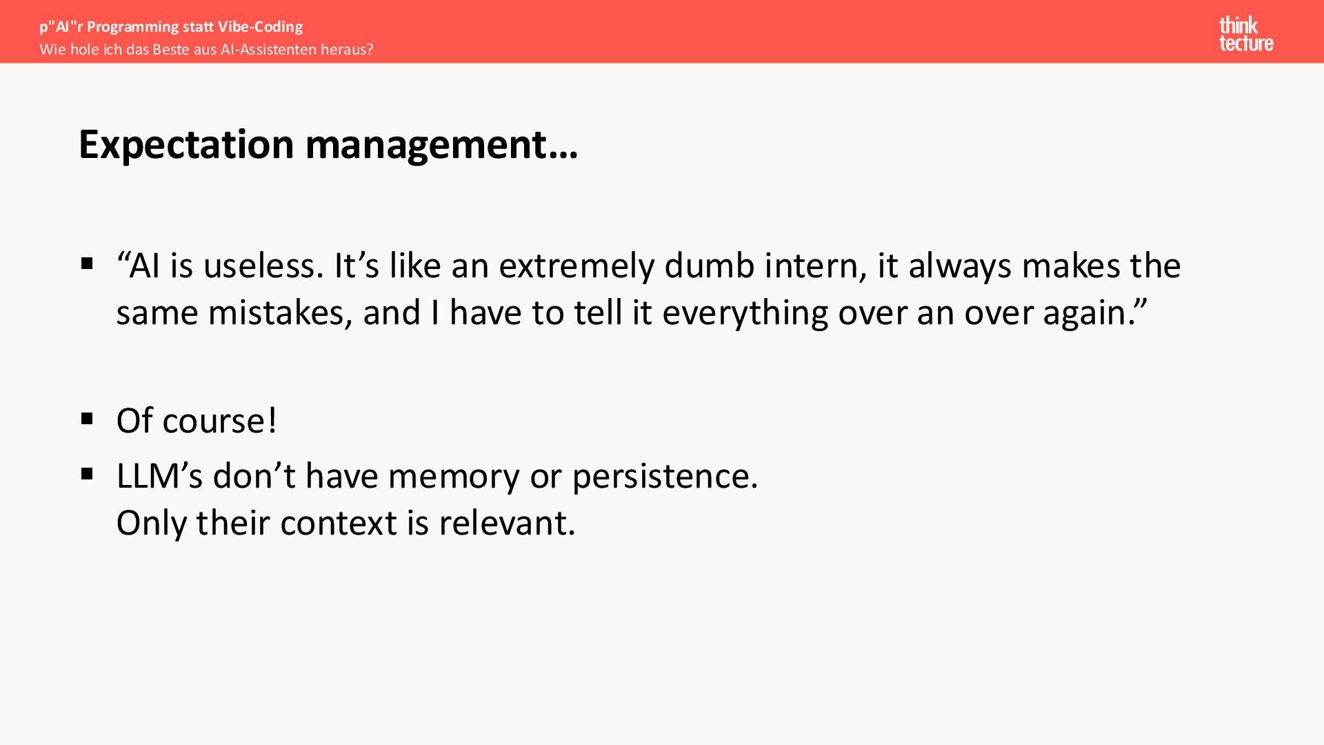 dumb intern, it always makes the same mistakes, and I have to tell it everything over an over again.” ▪ Of course! ▪ LLM’s don’t have memory or persistence. Only their context is relevant. Wie hole ich das Beste aus AI-Assistenten heraus? p"AI"r Programming statt Vibe-Coding