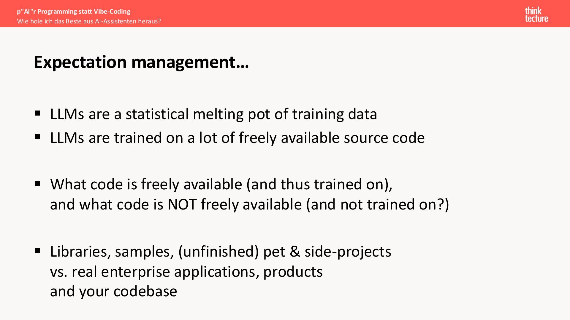 training data ▪ LLMs are trained on a lot of freely available source code ▪ What code is freely available (and thus trained on), and what code is NOT freely available (and not trained on?) ▪ Libraries, samples, (unfinished) pet & side-projects vs. real enterprise applications, products and your codebase Wie hole ich das Beste aus AI-Assistenten heraus? p"AI"r Programming statt Vibe-Coding