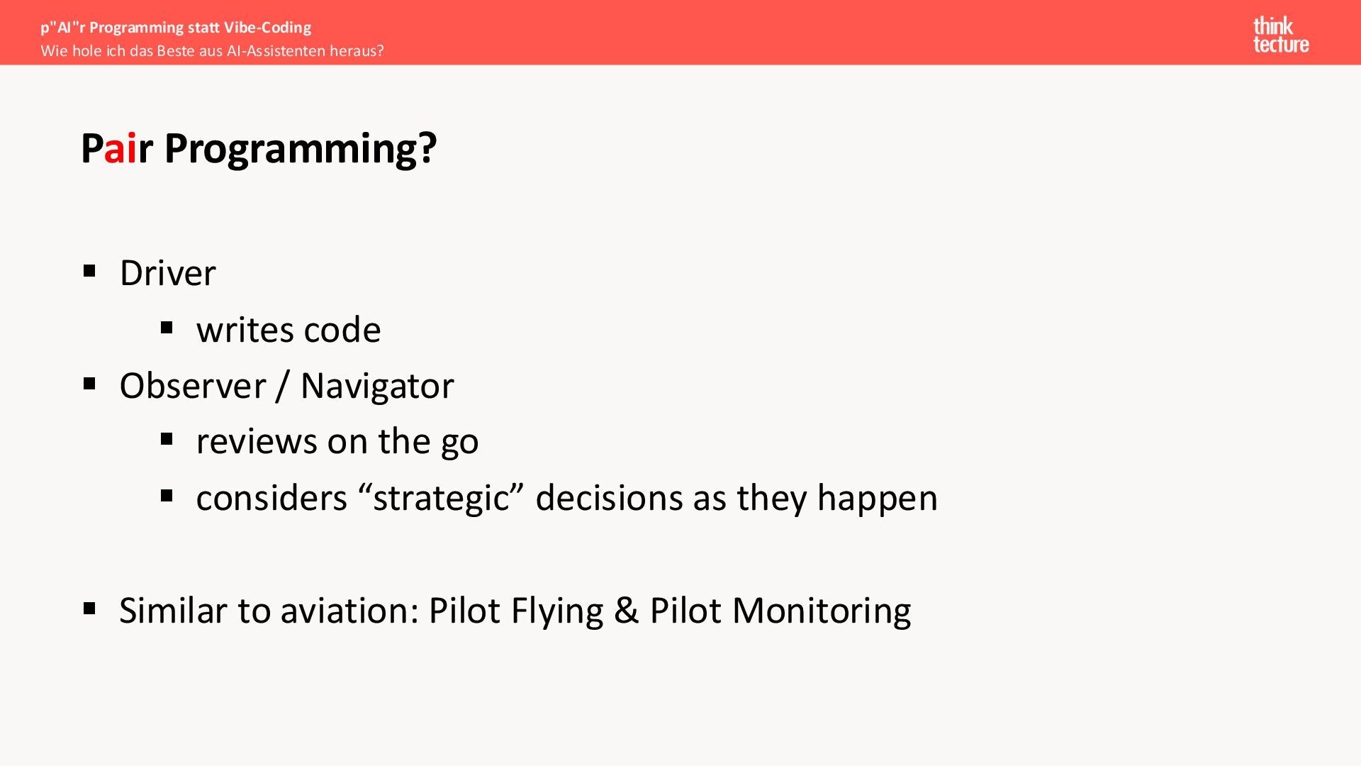 Navigator ▪ reviews on the go ▪ considers “strategic” decisions as they happen ▪ Similar to aviation: Pilot Flying & Pilot Monitoring Wie hole ich das Beste aus AI-Assistenten heraus? p"AI"r Programming statt Vibe-Coding