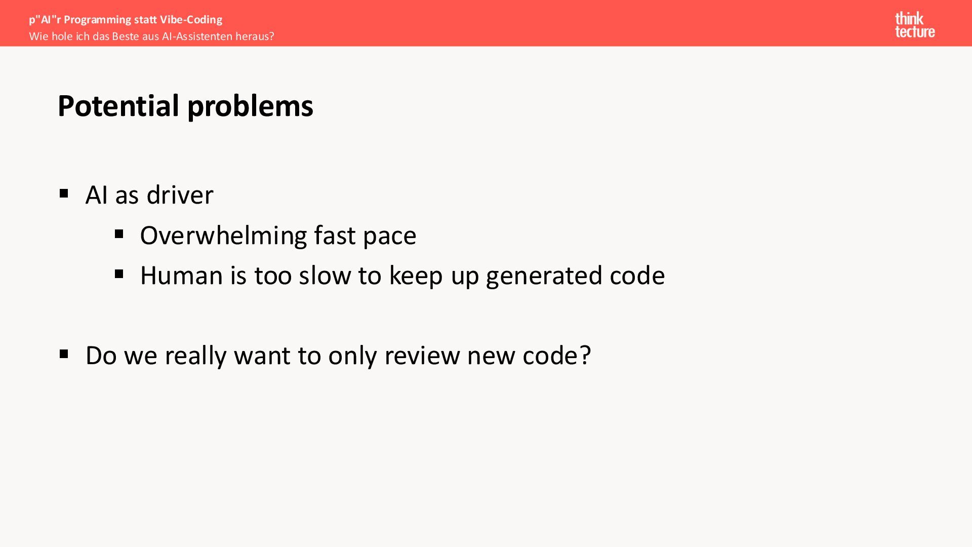 ▪ Human is too slow to keep up generated code ▪ Do we really want to only review new code? Wie hole ich das Beste aus AI-Assistenten heraus? p"AI"r Programming statt Vibe-Coding
